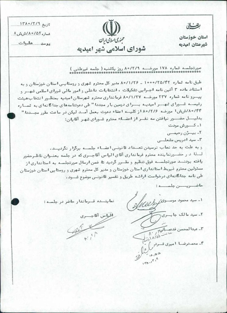 طبق نامه شماره ۴۲/ ۲۵/ ۱۰۰۰-۲۶/ ۱/ ۸۰ مدیرکل محترم شهری و روستایی استان خوزستان و به استناد ماده ۳ آئین نامه اجرایی تشکیلات ، انتخابات داخلی و امور مالی شورای اسلامی شهر و پیرو نامه شماره ۲۳۷ مورخ ۲۷/ ۱/ ۸۰فرمانداری محترم شهرستان امیدیه بمنظور انتخاب هیأت رئیسه شورای شهر امیدیه برای دومین بار مجدداً طی دعوتنامه های جداگانه ای به شماره ۴۴/ ۸۰/ش ش ا مورخ ۶/ ۲/ ۸۰از کلیه اعضاء دعوت بعمل آمد لیکن در ساعت مقرر مجدداً بدلیل حضور نیافتن سه نفر از اعضاء محترم شورای شهر آقایان: کورش مودت –بیژن رحیمی و سید ادریس مشعلی و به علت به حد نصاب نرسیدن تعداد قانونی اعضاء جلسه برگزار نگردید.