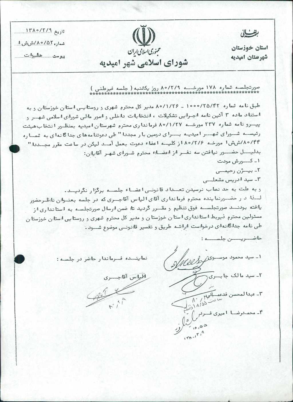 لذا در حضور نماینده محترم فرمانداری آقای الیاس آقاجری که در جلسه بعنوان ناظر حضور یافته بودند صورتجلسه فوق تنظیم و مقرر گردید تا ضمن ارسال صورتجلسه به استانداری از مسئولین محترم ذیربط استانداری استان خوزستان و مدیر کل محترم شهری و روستایی استان خوزستان طی نامه جداگانه ای درخواست ارائه طریق و تفسیر قانونی موضوع شود.