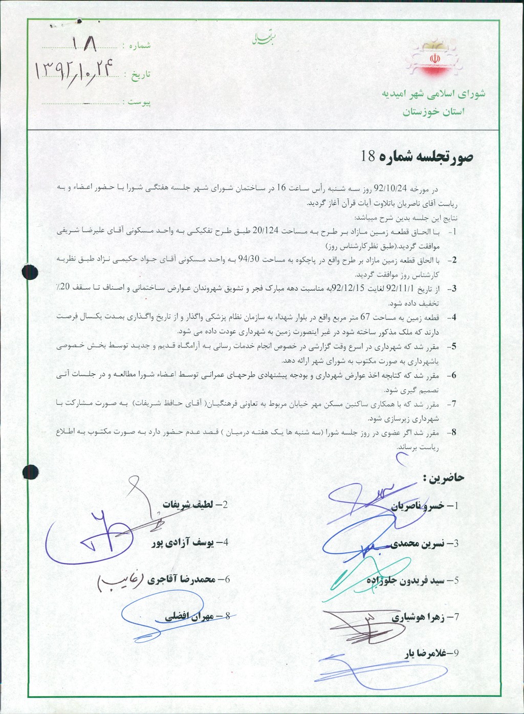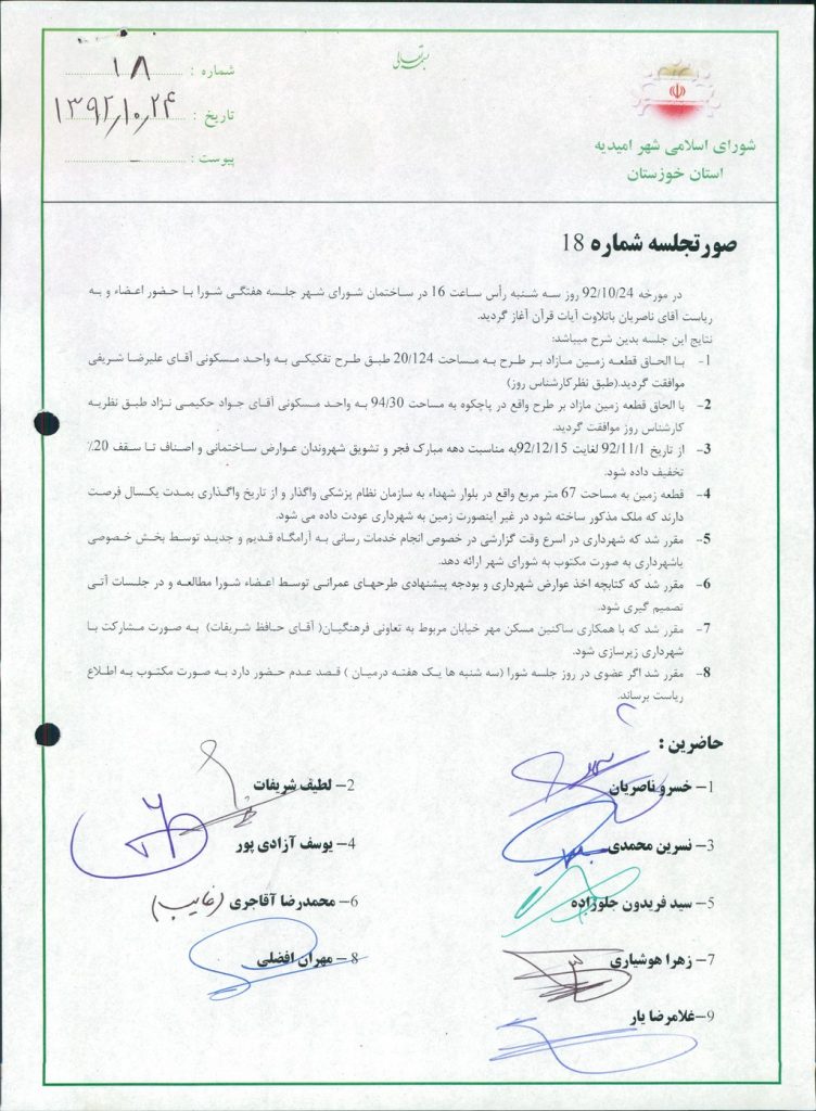 گزارش جلسه شماره ۱۸ مورخ ۹۲/۱۰/۲۴ شورای اسلامی شهر امیدیه