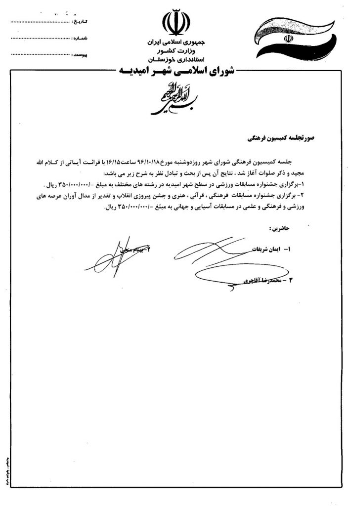 ۱-برگزاری جشنواره مسابقات ورزشی در سطح شهر امیدیه در رشته های مختلف به مبلغ ۳۵۰۰۰۰۰۰۰ ریال .
