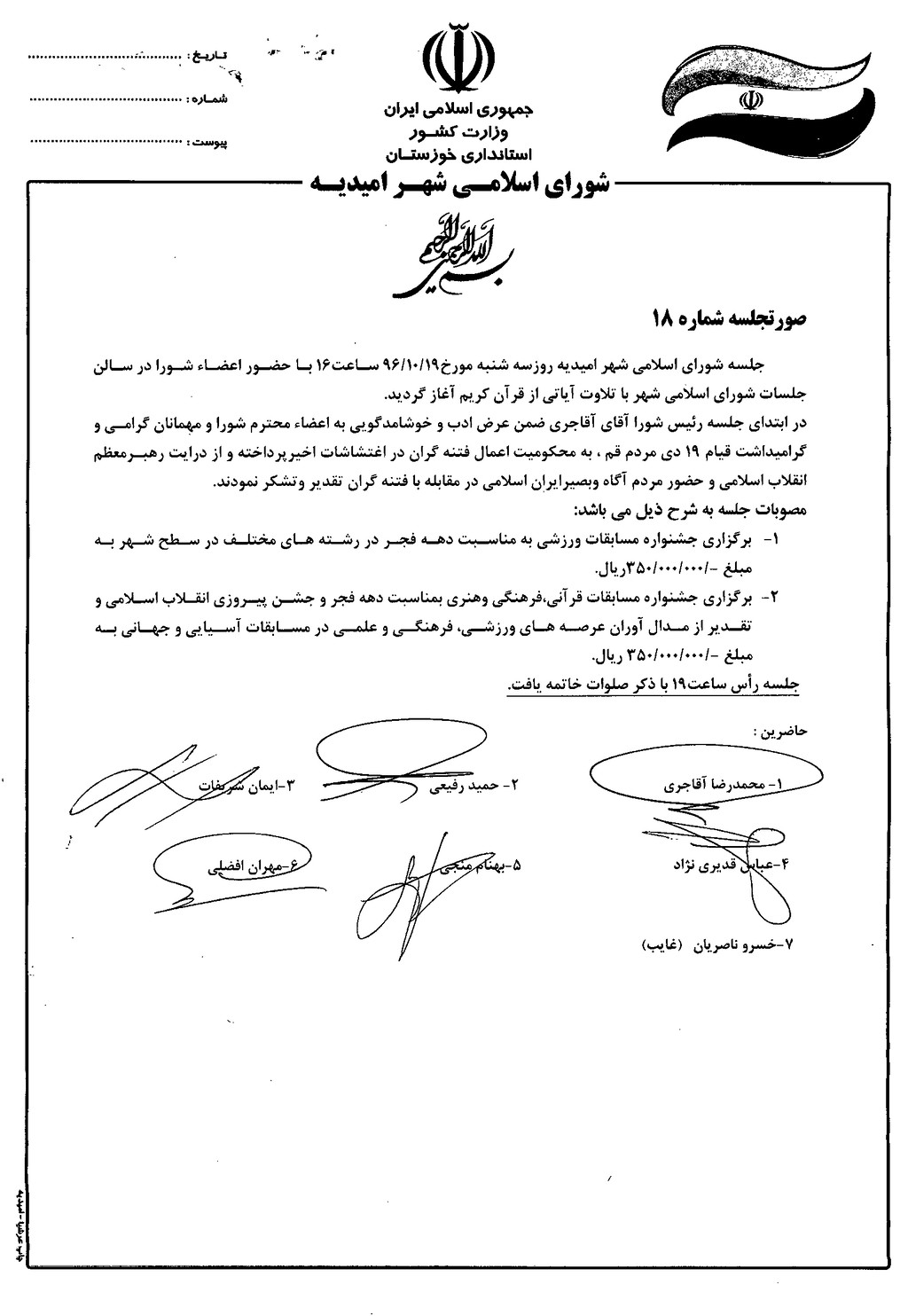 گزارش جلسه شماره ۱۸ مورخ ۹۶/۱۰/۱۹ شورای اسلامی شهر امیدیه