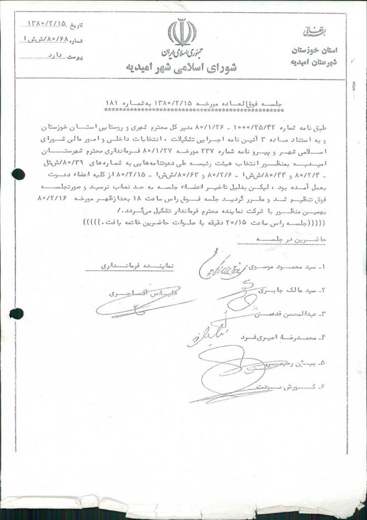 طبق نامه شماره ۴۲/ ۲۵/۱۰۰۰-۲۶/ ۱/ ۸۰ مدیرکل محترم شهری و روستایی استان خوزستان و به استناد ماده ۳ آئین نامه اجرایی تشکیلات ، انتخابات داخلی و امور مالی شورای اسلامی شهر و پیرو نامه شماره ۲۳۷ مورخ ۲۷/ ۱/ ۸۰فرمانداری محترم شهرستان امیدیه بمنظور انتخاب هیأت رئیسه طی دعوتنامه هایی به شماره های ۳۹/ ۸۰/ش ش ا مورخ ۴/۲/ ۸۰ و ۴۴/ ۸۰/ش ش ا -۶/ ۲/ ۸۰ و ۶۳/ ۸۰/ش ش ا -۱۵/ ۲/ ۸۰ از کلیه اعضاء دعوت بعمل آمده بود لیکن بدلیل تأخیر اعضاء جلسه به حد نصاب نرسید و صورتجلسه فوق تنظیم و مقرر گردید جلسه فوق راس ساعت ۱۸ مورخ ۱۶/ ۲/ ۸۰ بهمین منظور با شرکت نماینده محترم فرمانداری تشکیل گردد.