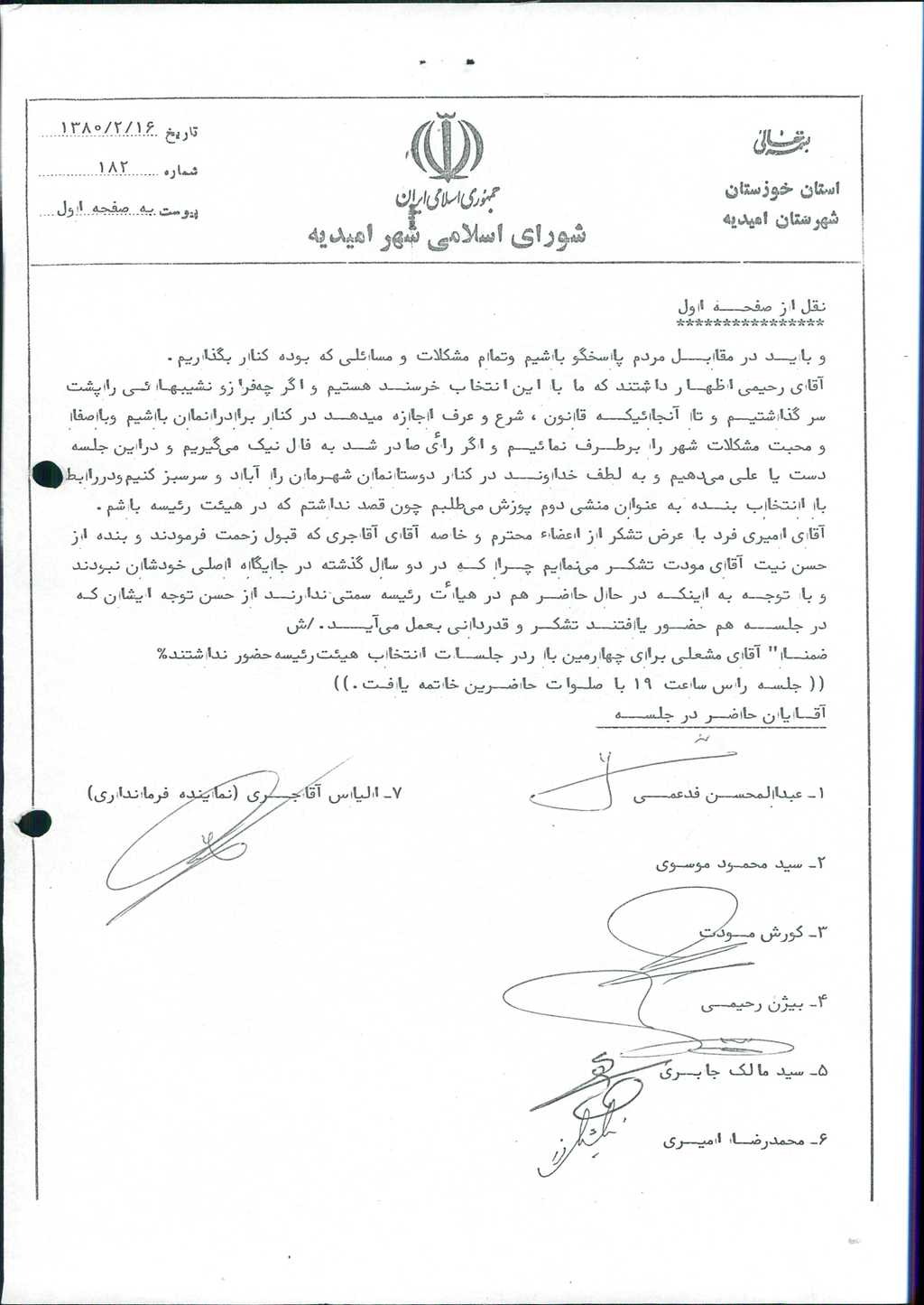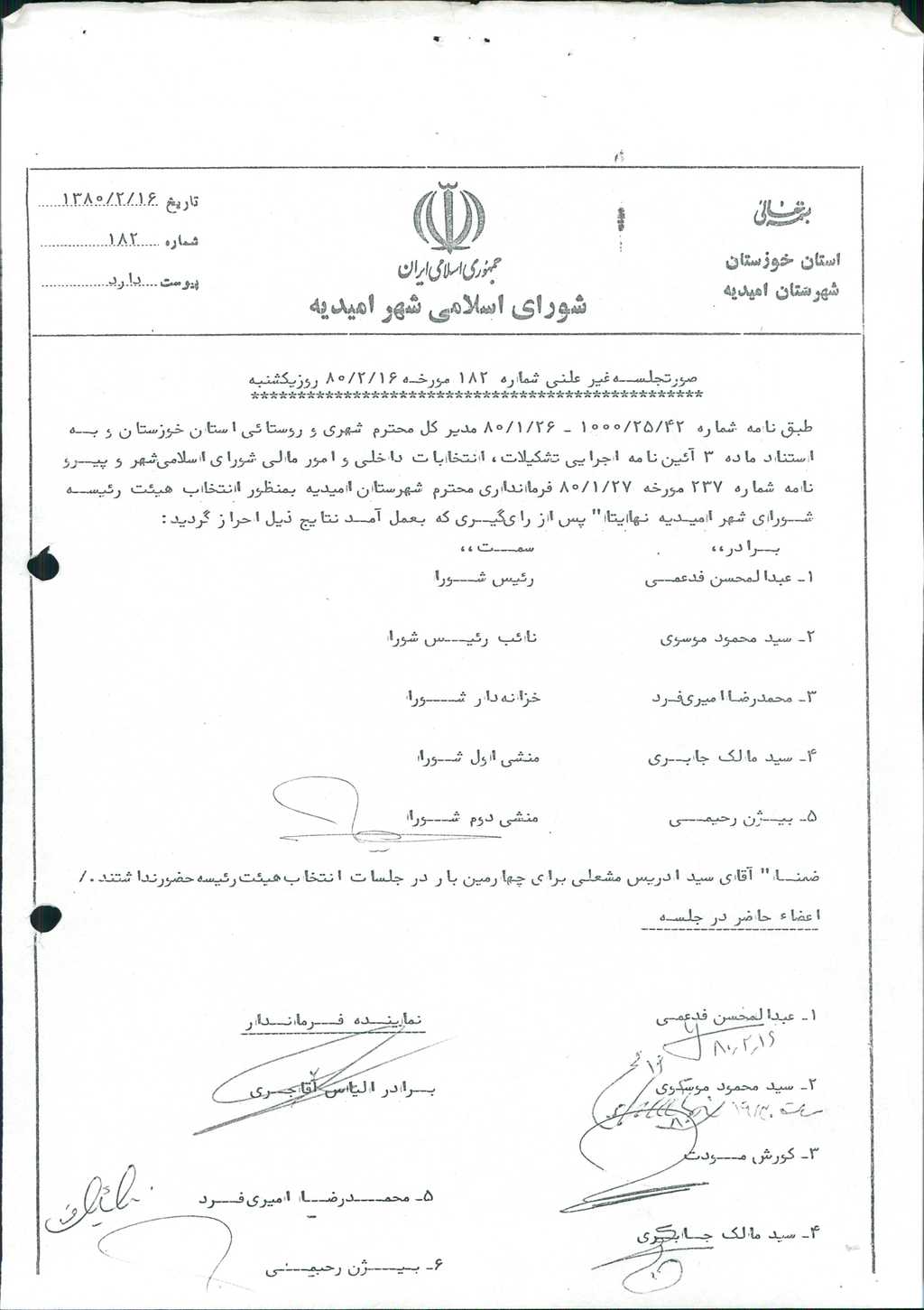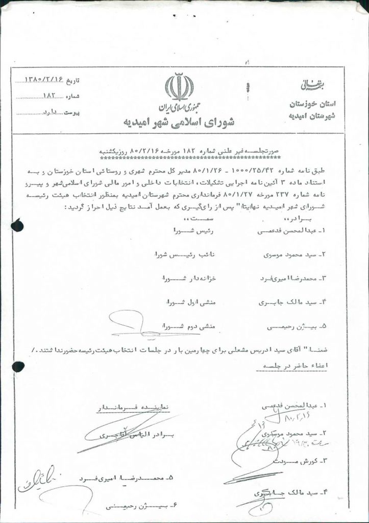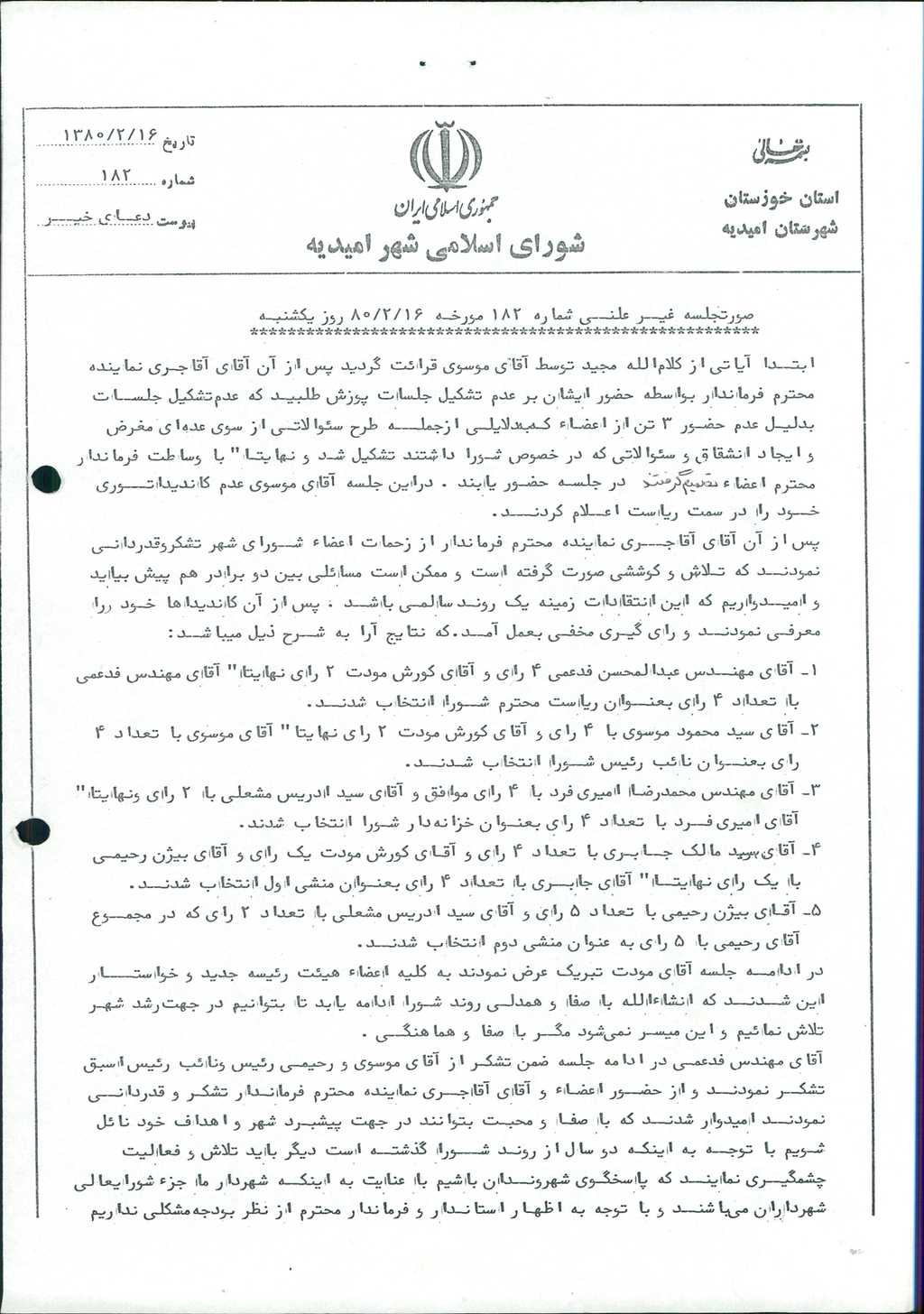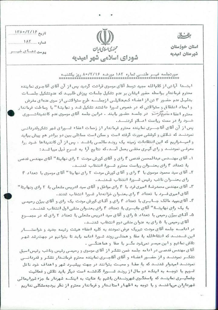 بسم الله الرحمن الرحیم گزارش جلسه شماره ۱۸۲ شورای اسلامی شهر امیدیه