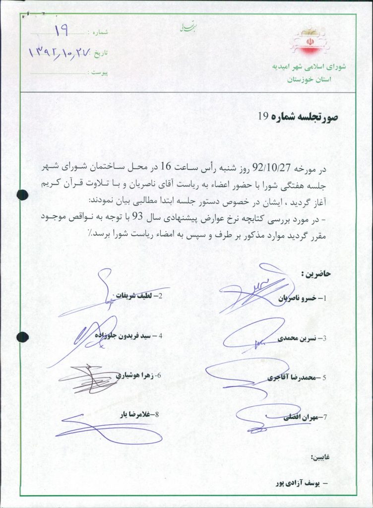 گزارش جلسه شماره ۱۹ مورخ ۹۲/۱۰/۲۷ شورای اسلامی شهر امیدیه