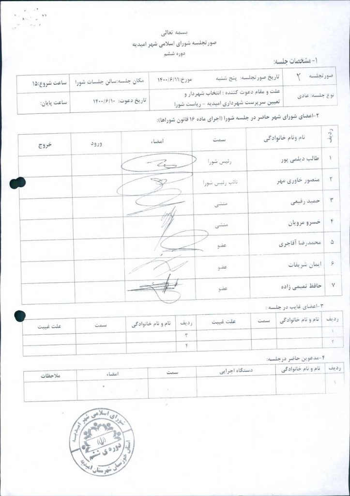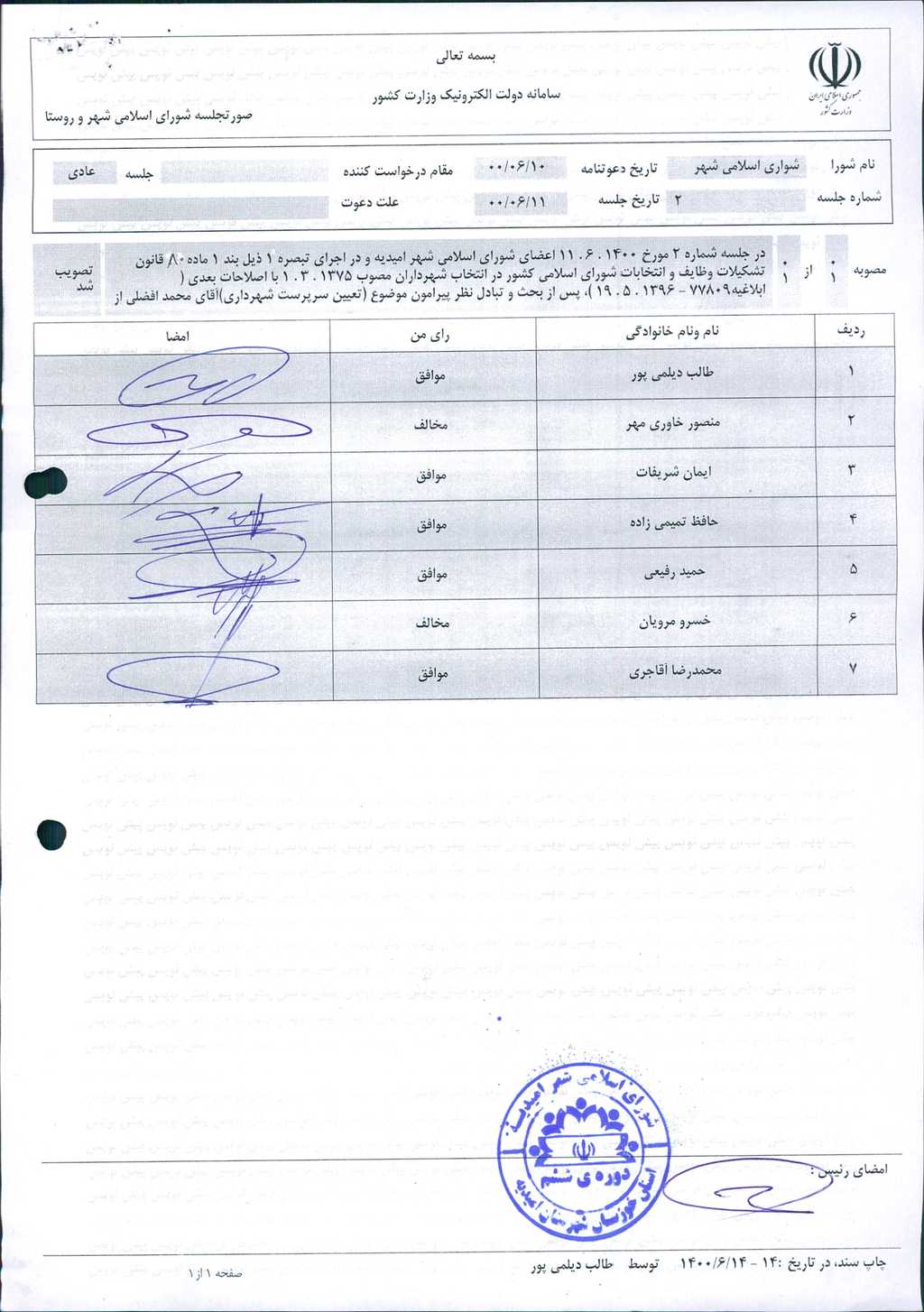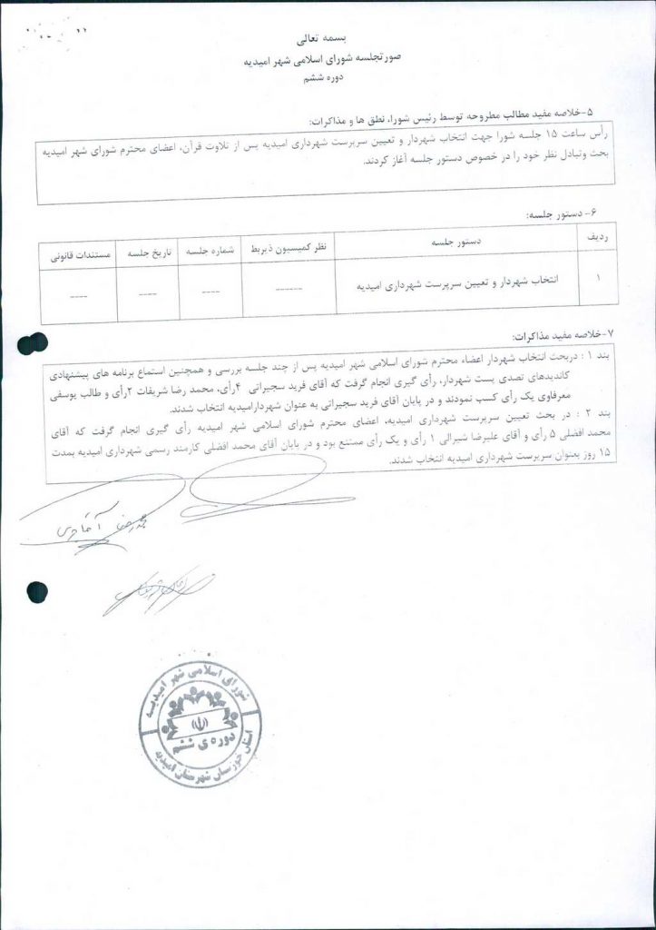 بند ۲ : در بحث تعیین سرپرست شهرداری امیدیه، اعضای محترم شورای اسلامی شهر امیدیه رأی گیری انجام گرفت که آقای محمد افضلی ۵ رأی و آقای علیرضا شیرالی ۱ رأی و یک رأی ممتنع بود و در پایان آقای محمد افضلی کارمند رسمی شهرداری امیدیه بمدت ۱۵ روز بعنوان سرپرست شهرداری امیدیه انتخاب شدند.