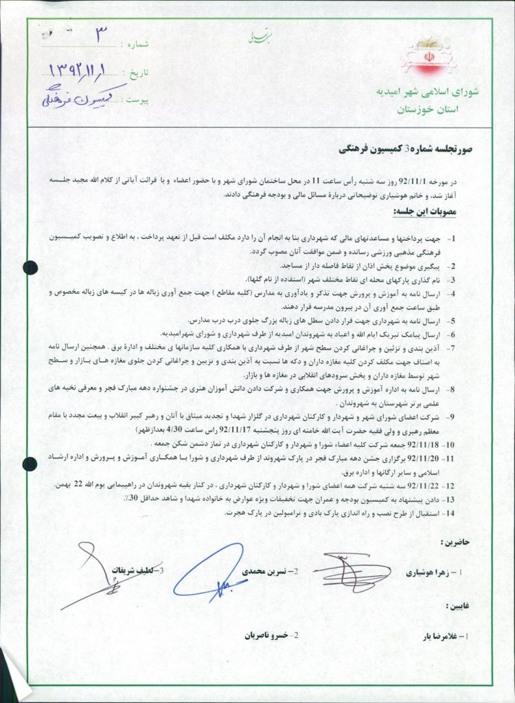 گزارش جلسه شماره ۲۰ کمیسیون فرهنگی شورای اسلامی شهر امیدیه