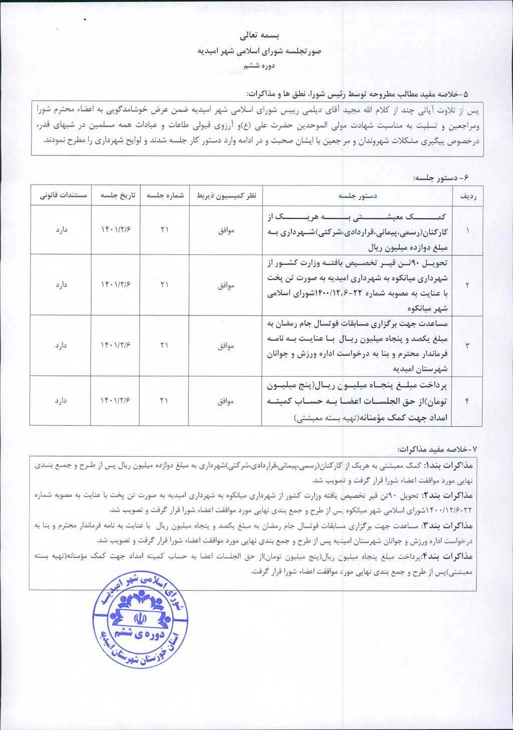 مذاکرات بند۴:پرداخت مبلغ پنجاه میلیون ریال(پنج میلیون تومان)از حق الجلسات اعضا به حساب کمیته امداد جهت کمک مؤمنانه(تهیه بسته معیشتی)پس از طرح و جمع بندی نهایی مورد موافقت اعضاء شورا قرار گرفت.