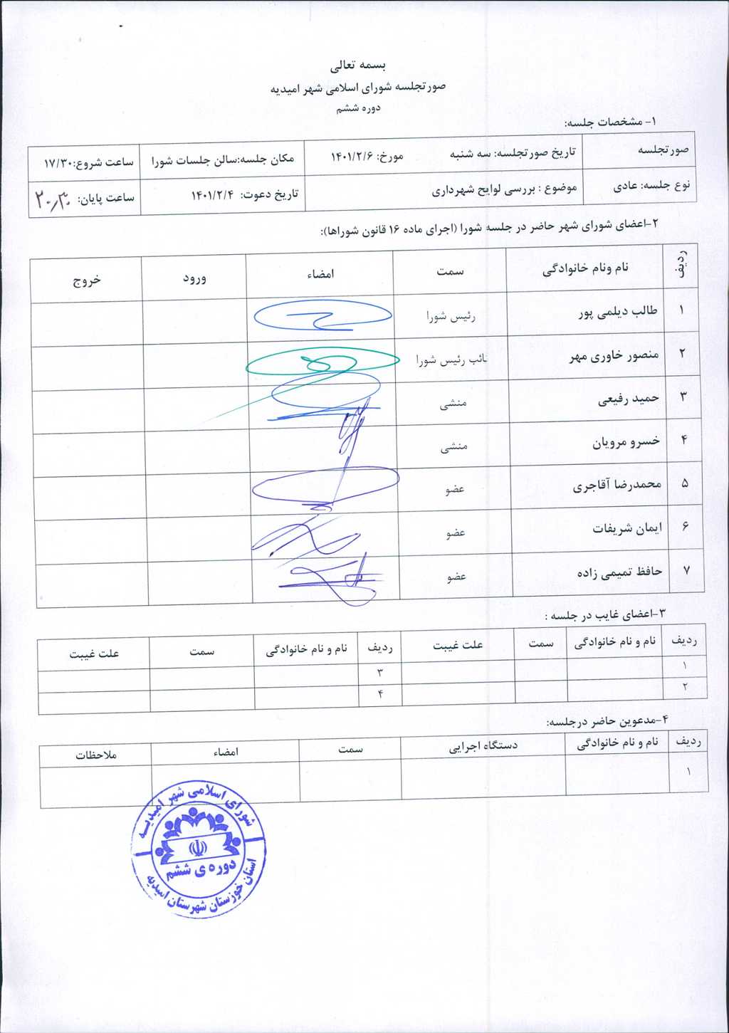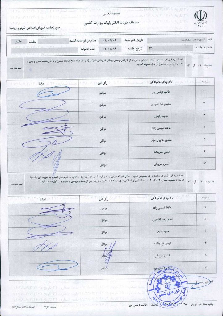 مذاکرات بند۲: تحویل ۹۰تن قیر تخصیص یافته وزارت کشور از شهرداری میانکوه به شهرداری امیدیه به صورت تن پخت با عنایت به مصوبه شماره ۲۲-۶/۱۲/۱۴۰۰شورای اسلامی شهر میانکوه پس از طرح و جمع بندی نهایی مورد موافقت اعضاء شورا قرار گرفت و تصویب شد.
