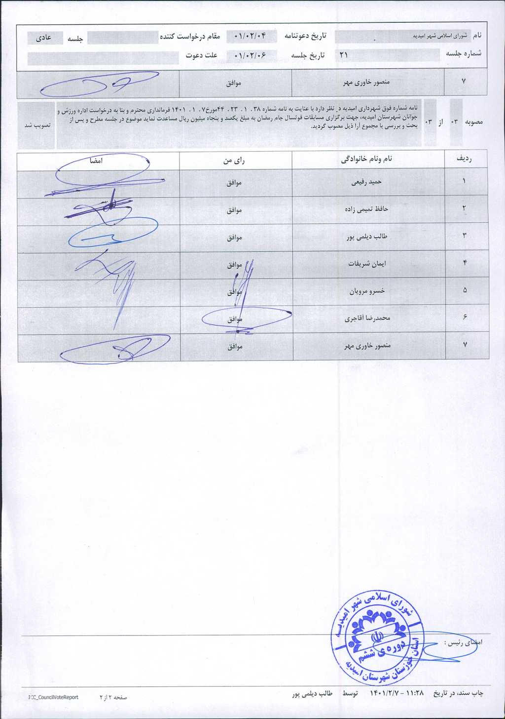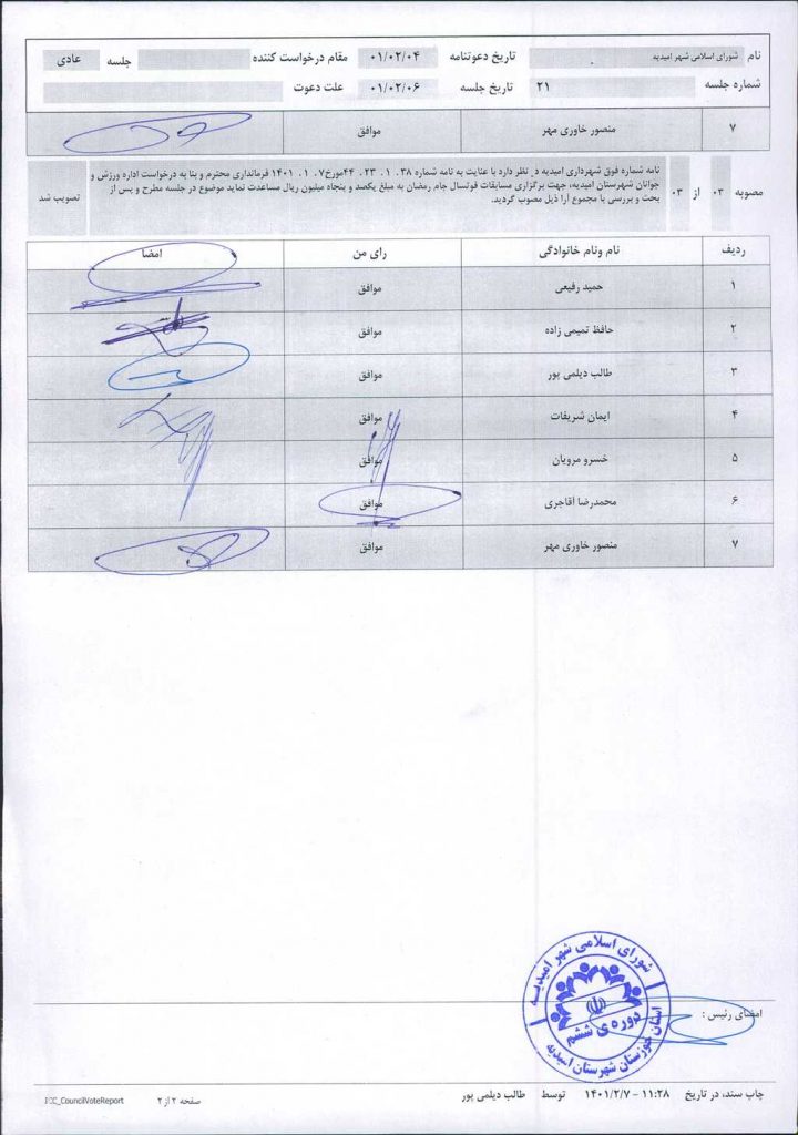 مذاکرات بند۳: مساعدت جهت برگزاری مسابقات فوتسال جام رمضان به مبلغ یکصد و پنجاه میلیون ریال با عنایت به نامه فرماندار محترم و بنا به درخواست اداره ورزش و جوانان شهرستان امیدیه پس از طرح و جمع بندی نهایی مورد موافقت اعضاء شورا قرار گرفت و تصویب شد.
