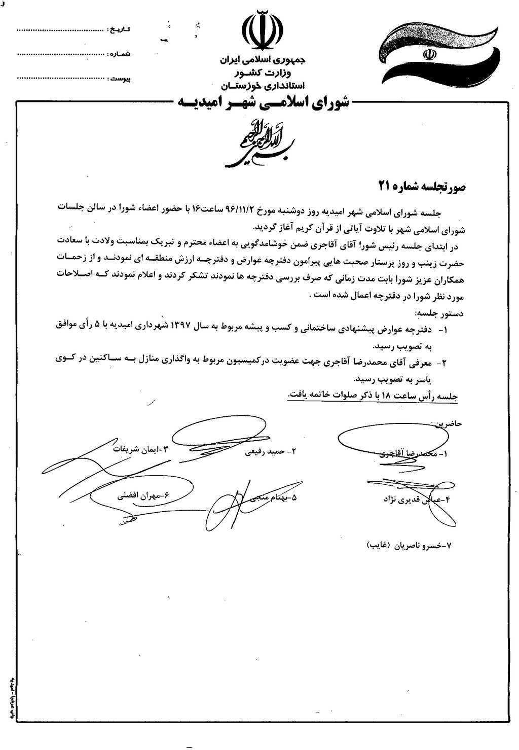 گزارش جلسه شماره ۲۱ مورخ ۹۶/۱۱/۲ شورای اسلامی شهر امیدیه