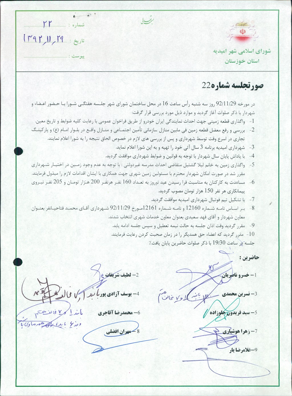 در مورخه ۲۹/۱۱/۹۲ روز سه شنبه رأس ساعت ۱۶ در محل ساختمان شورای شهر جلسه هفتگی شورا با حضور اعضاء و شهردار با ذکر صلوات آغاز گردید و موارد ذیل مورد بررسی قرار گرفت: