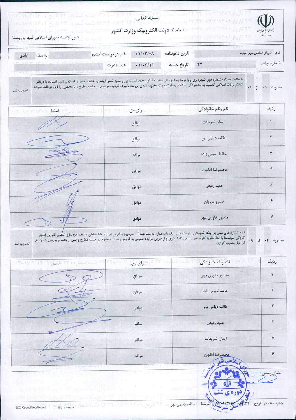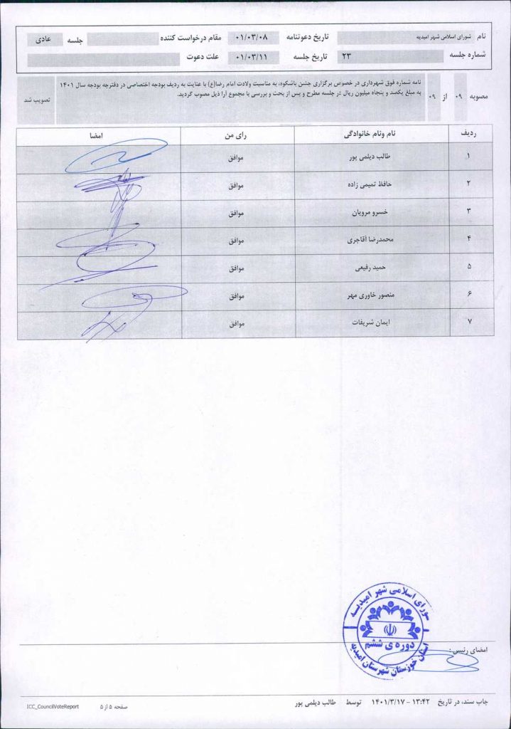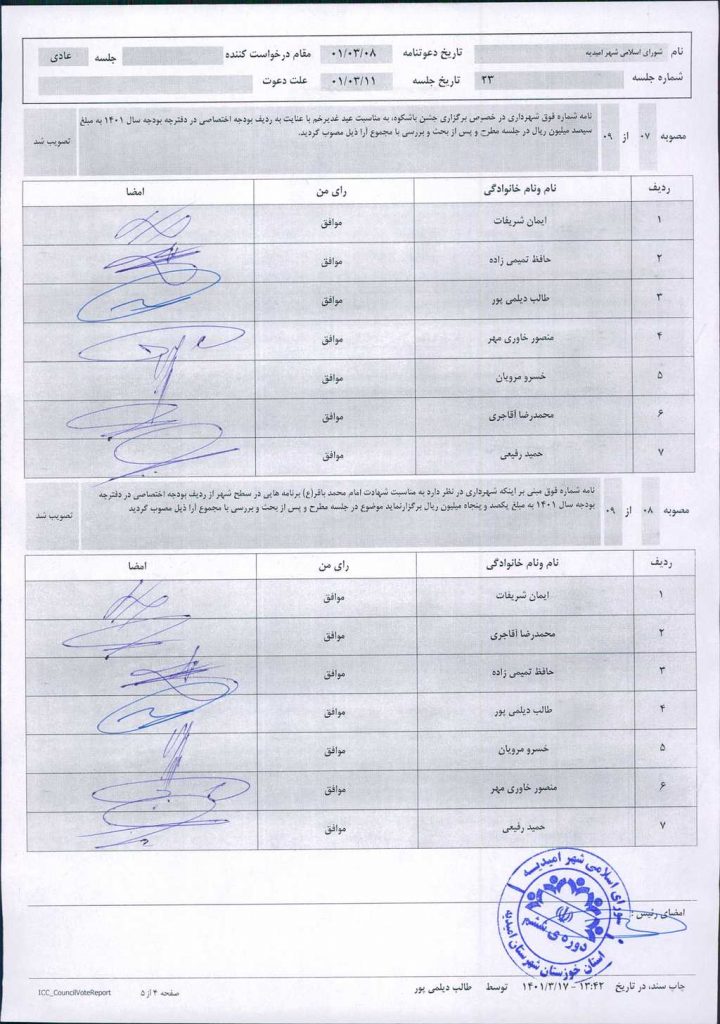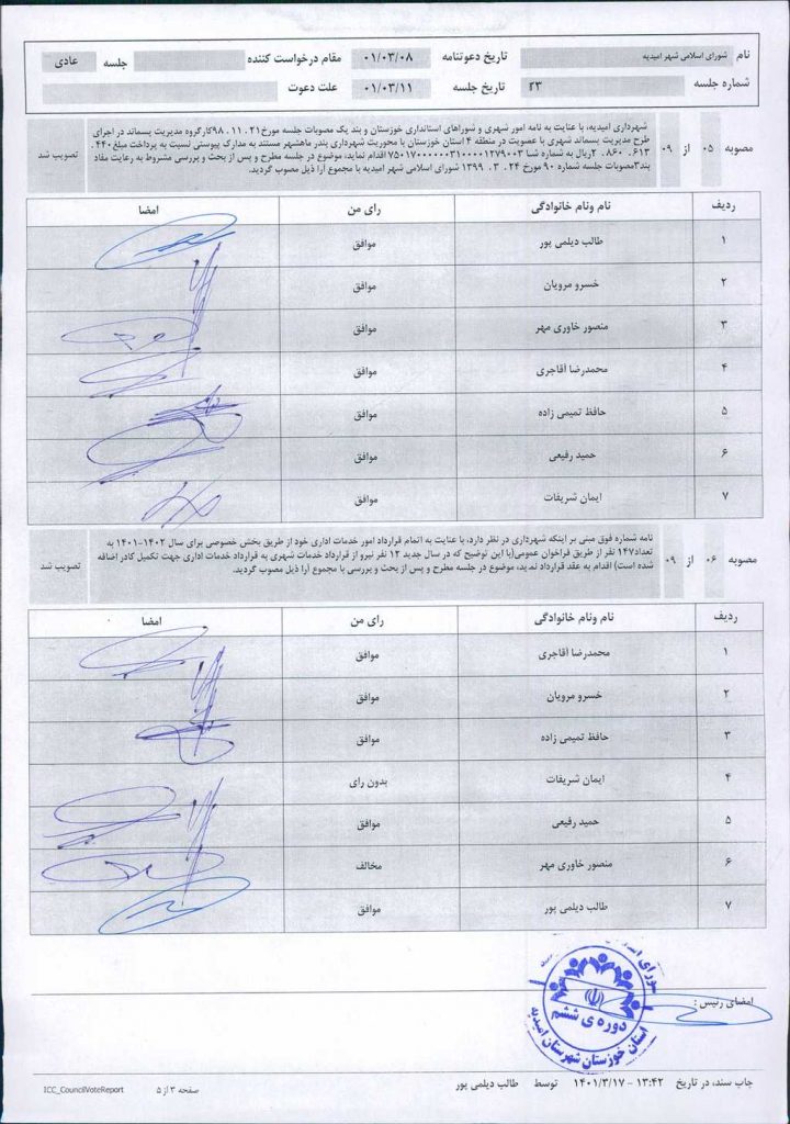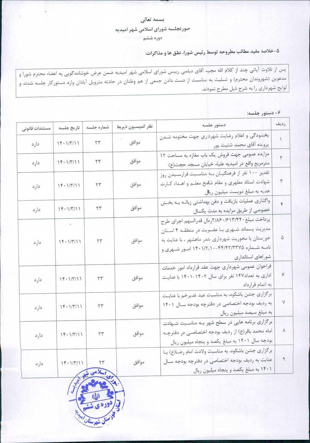 گزارش جلسه شماره ۲۳ مورخ ۱۴۰۱/۳/۱۱ شورای اسلامی شهر امیدیه