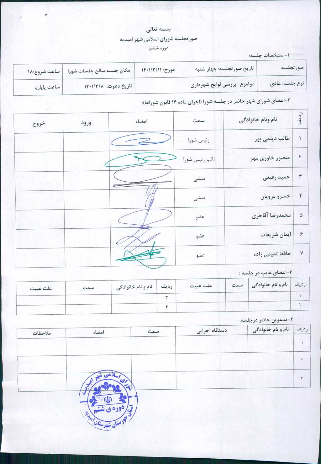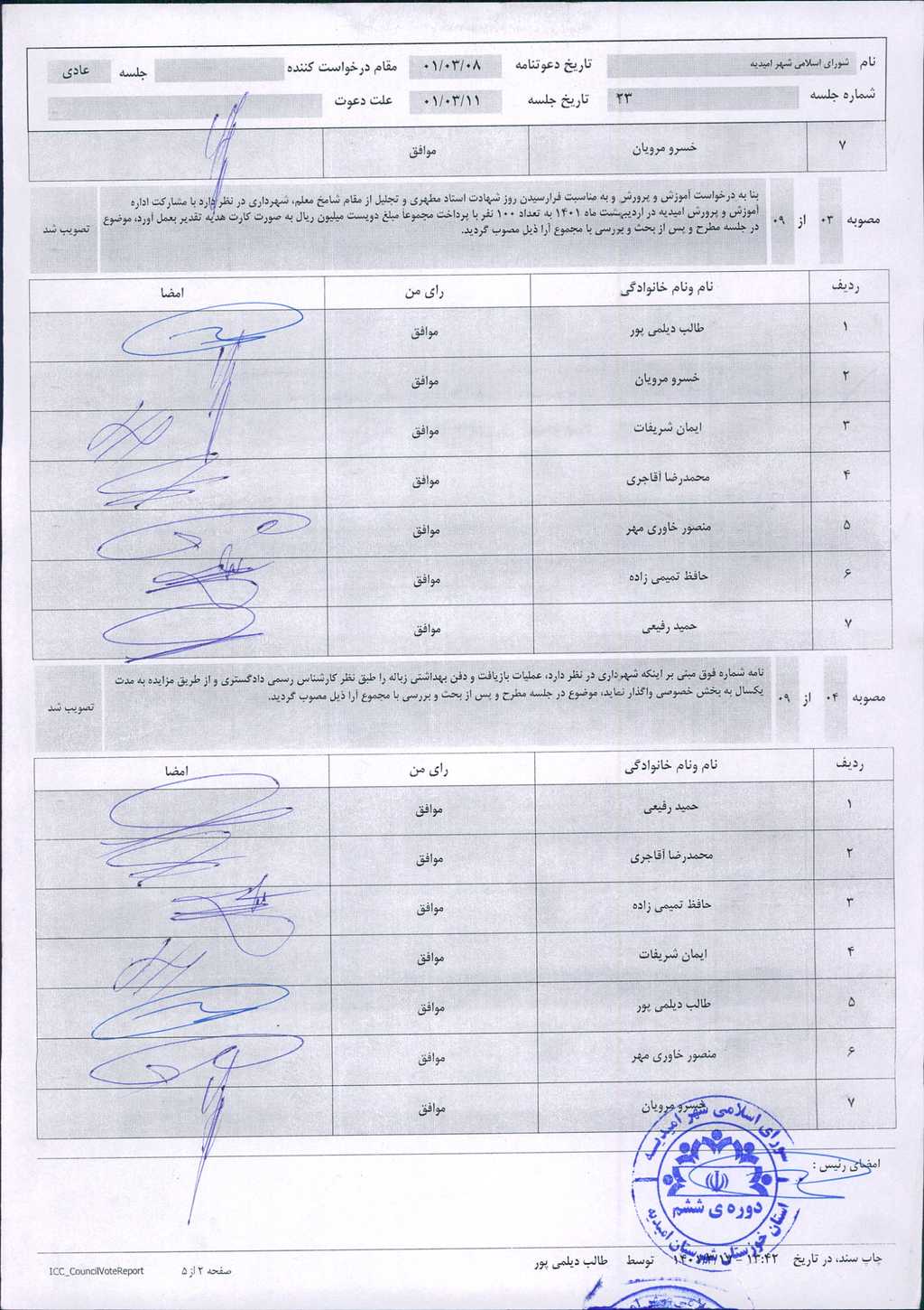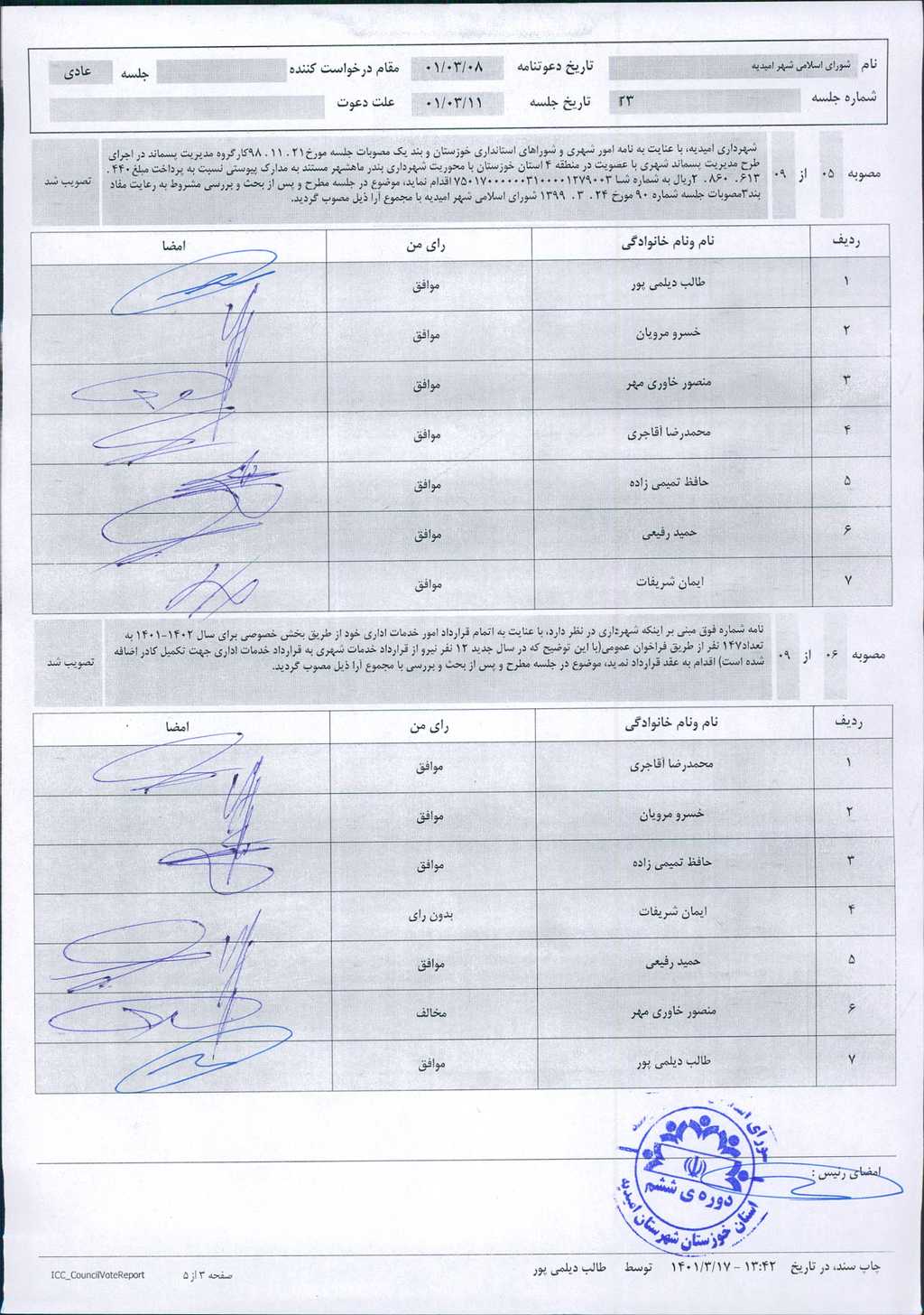 گزارش جلسه شماره ۲۳ مورخ ۱۴۰۱/۳/۱۱ شورای اسلامی شهر امیدیه