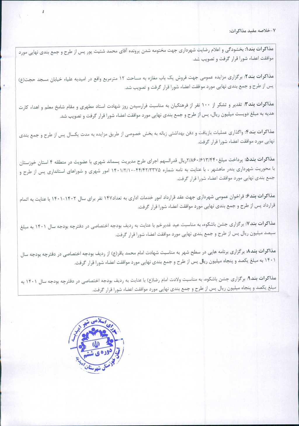 مذاکرات بند۹: برگزاری جشن باشکوه، به مناسبت ولادت امام رضا(ع) با عنایت به ردیف بودجه اختصاصی در دفترچه بودجه سال ۱۴۰۱ به مبلغ یکصد و پنجاه میلیون ریال پس از طرح و جمع بندی نهایی مورد موافقت اعضاء شورا قرار گرفت.