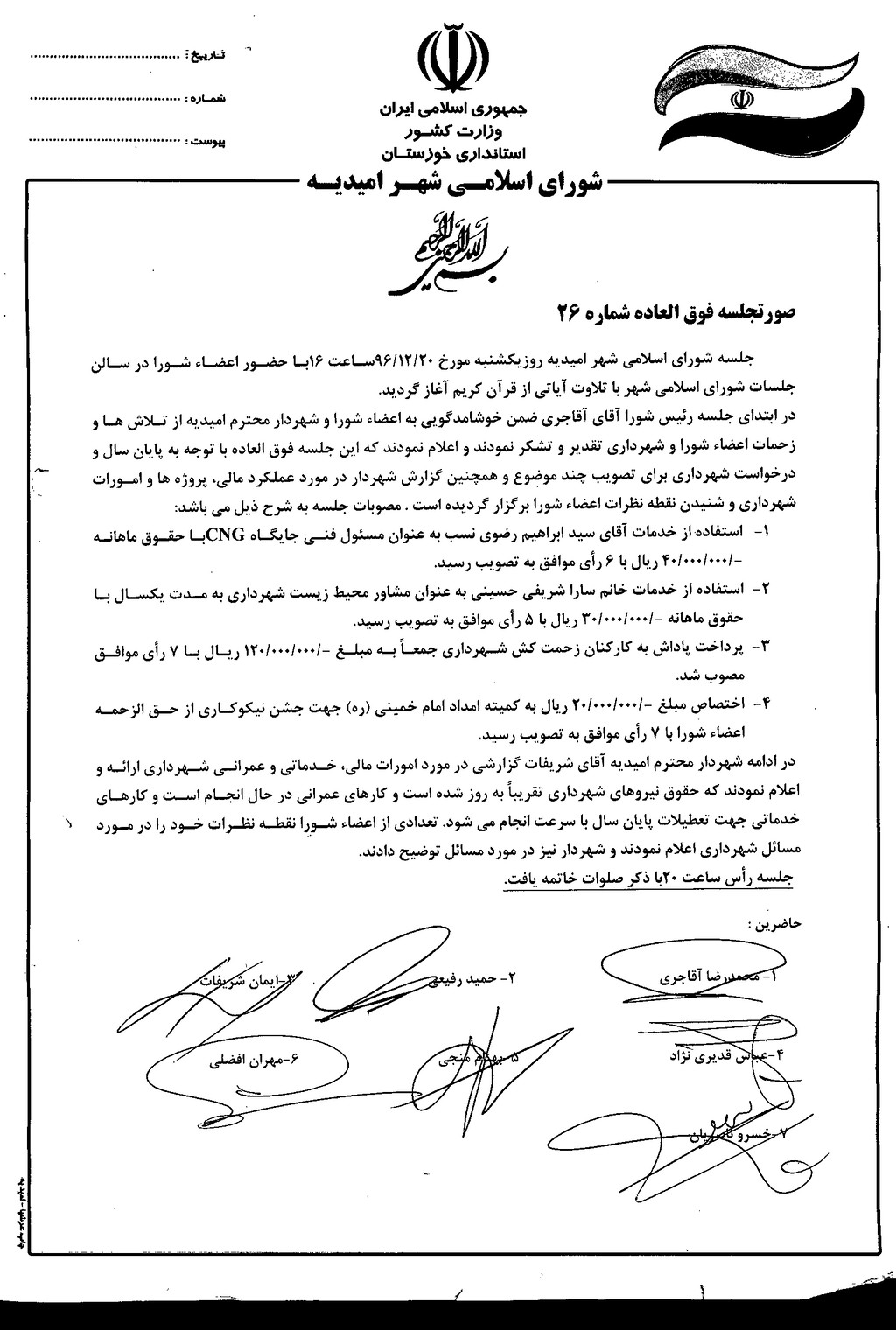 گزارش جلسه فوق العاده شماره ۲۶ شورای اسلامی شهر امیدیه