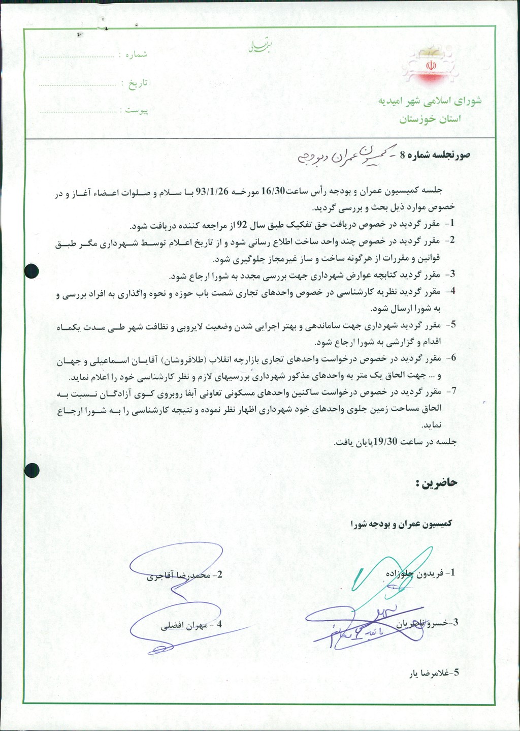 گزارش جلسه شماره ۲۷ مورخ ۹۳/۱/۲۶ کمیسیون عمران شورای اسلامی شهر امیدیه