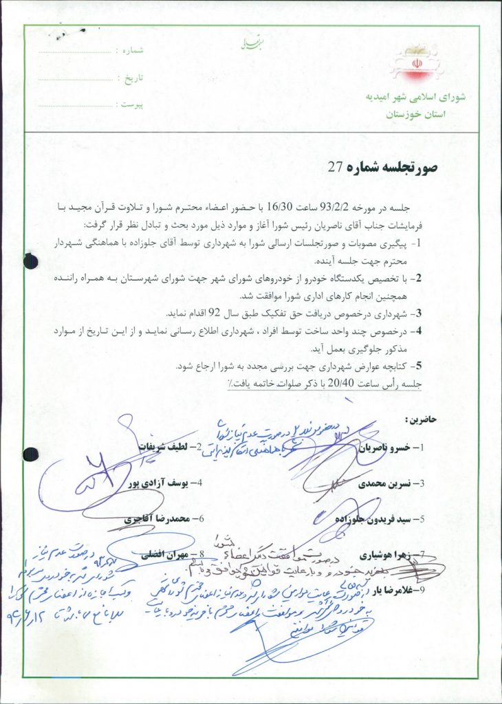 گزارش جلسه شماره ۲۷ مورخ ۹۳/۲/۲ شورای اسلامی شهر امیدیه