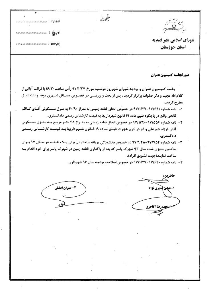- نامه شماره ۹۷/۵۵۶-۹۷/۱/۲۶ در خصوص الحاق قطعه زمینی به متراژ ۴۸ متر مربع به منزل مسکونی آقای فرزاد شیرعلی واقع در کوی هجرت طبق ماده ۱۹ قانون شهرداریها به قیمت کارشناس رسمی دادگستری.