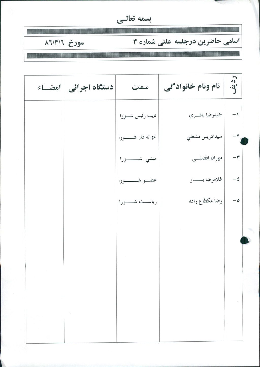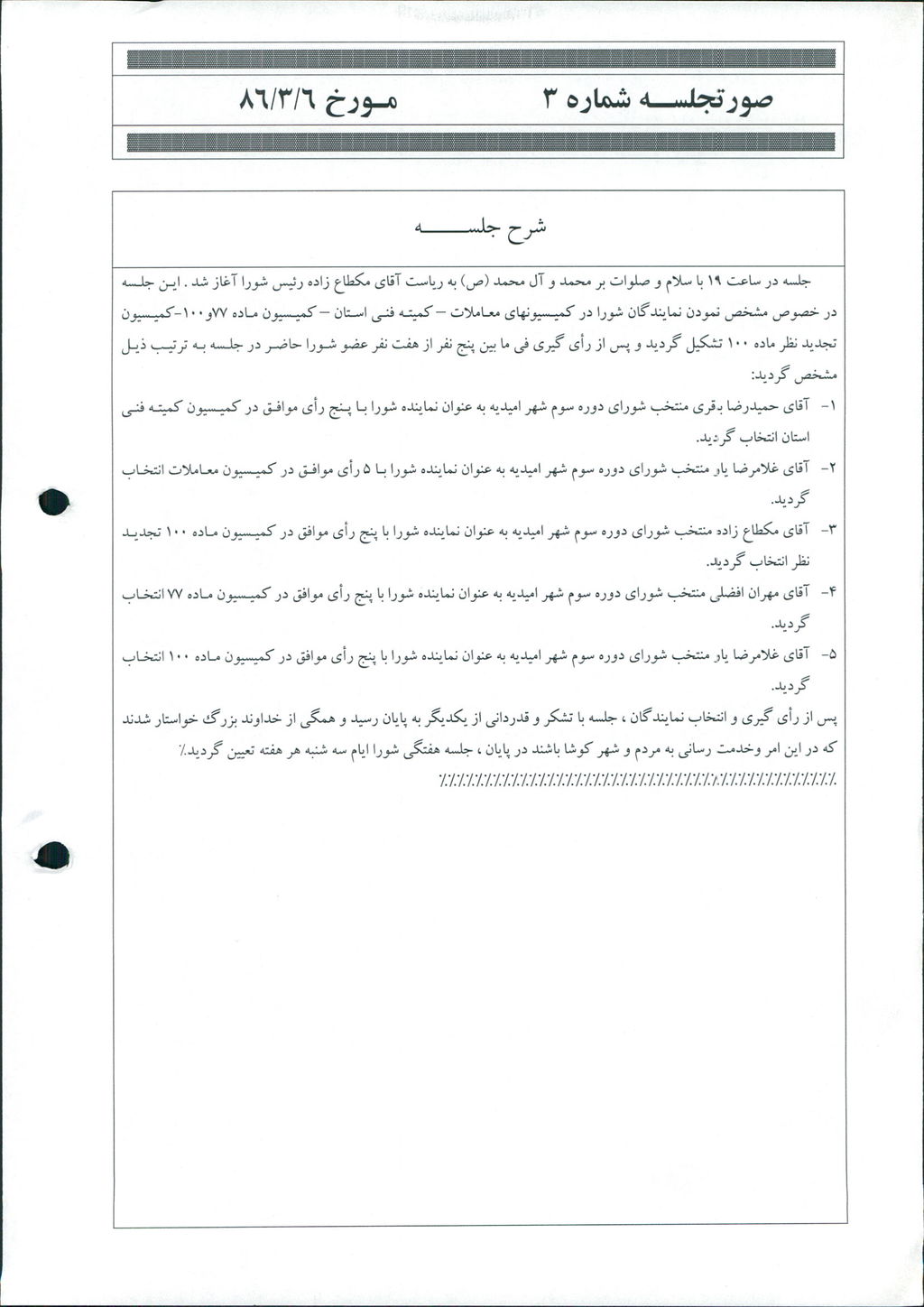 جلسه در ساعت ۱۹ با سلام و صلوات بر محمد و آل محمد (ص) به رياست آقاي مكطاع زاده رئيس شورا آغاز شد . اين جلسه در خصوص مشخص نمودن نمايندگان شورا در كميسيونهاي معاملات – كميته فني استان – كميسيون ماده ۷۷و۱۰۰-كميسيون تجديد نظر ماده ۱۰۰ تشكيل گرديد و پس از رأي گيري في ما بين پنج نفر از هفت نفر عضو شورا حاضر در جلسه به ترتيب ذيل مشخص گرديد: