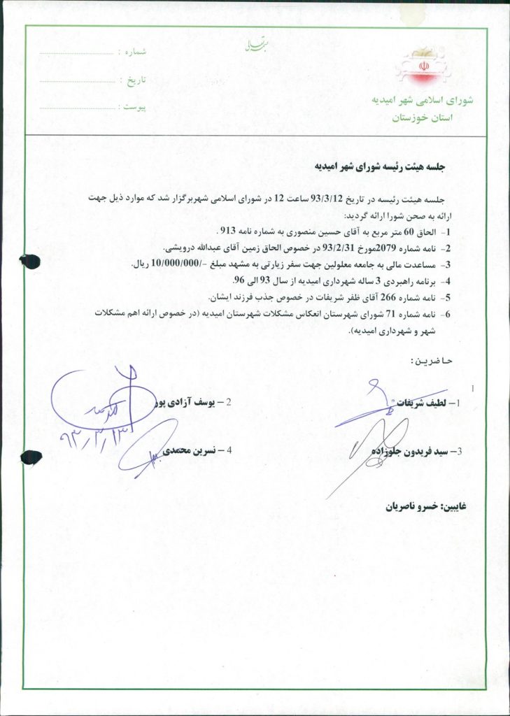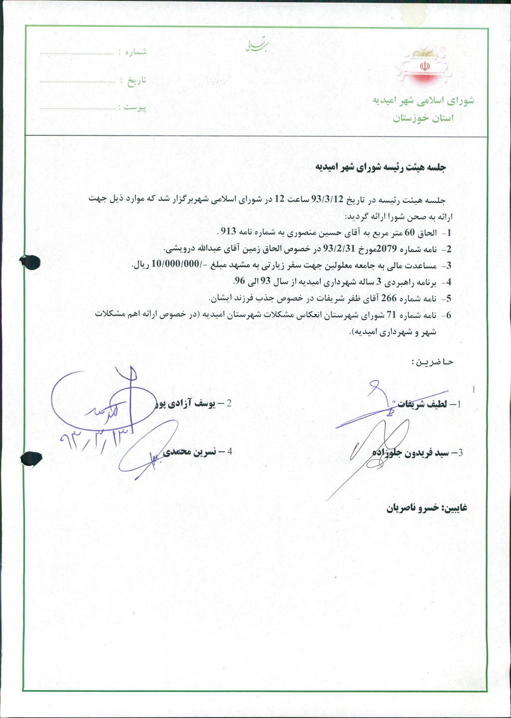 گزارش جلسه شماره ۳۰ مورخ ۹۳/۳/۱۲ هیئت رئیسه شورای اسلامی شهر امیدیه