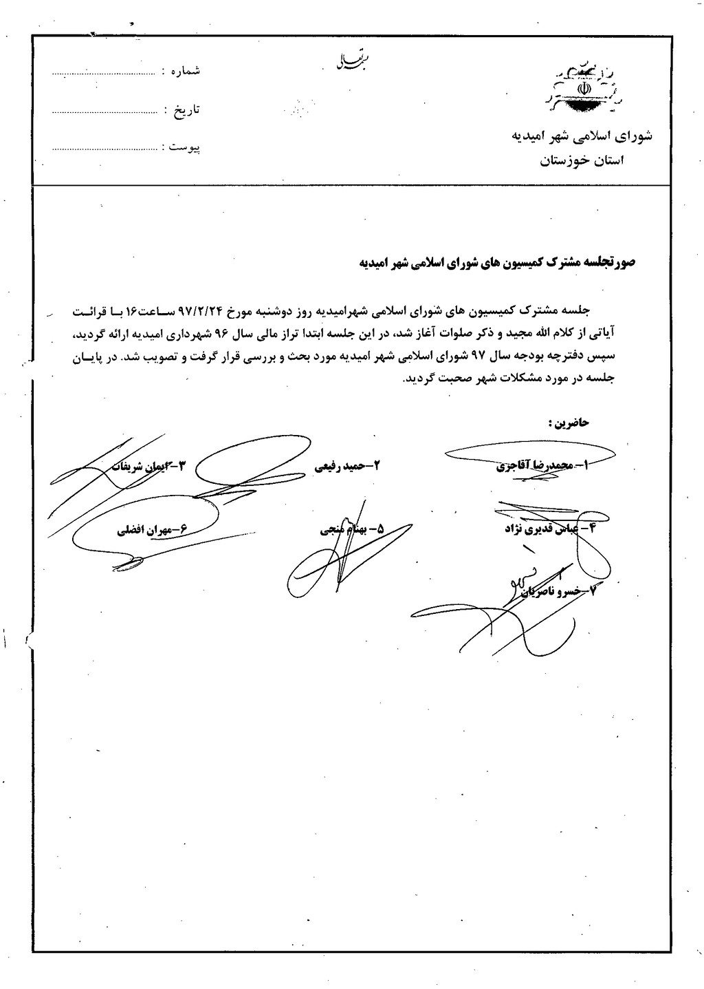 جلسه مشترک کمیسیون های شورای اسلامی شهرامیدیه روز دوشنبه مورخ ۲۴/۲/۹۷ ساعت۱۶ با قرائت آیاتی از کلام الله مجید و ذکر صلوات آغاز شد، در این جلسه ابتدا تراز مالی سال ۹۶ شهرداری امیدیه ارائه گردید، سپس دفترچه بودجه سال ۹۷ شورای اسلامی شهر امیدیه مورد بحث و بررسی قرار گرفت و تصویب شد. در پایان جلسه در مورد مشکلات شهر صحبت گردید.