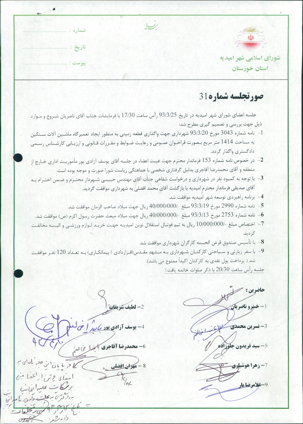 جلسه اعضای شورای شهر امیدیه در تاریخ ۲۵/۳/۹۳ رأس ساعت ۳۰/۱۷ با فرمایشات جناب آقای ناصریان شروع و موارد ذیل جهت بررسی و تصمیم گیری مطرح شد: