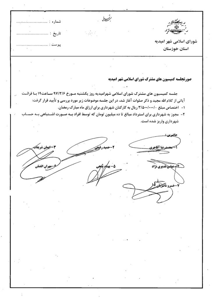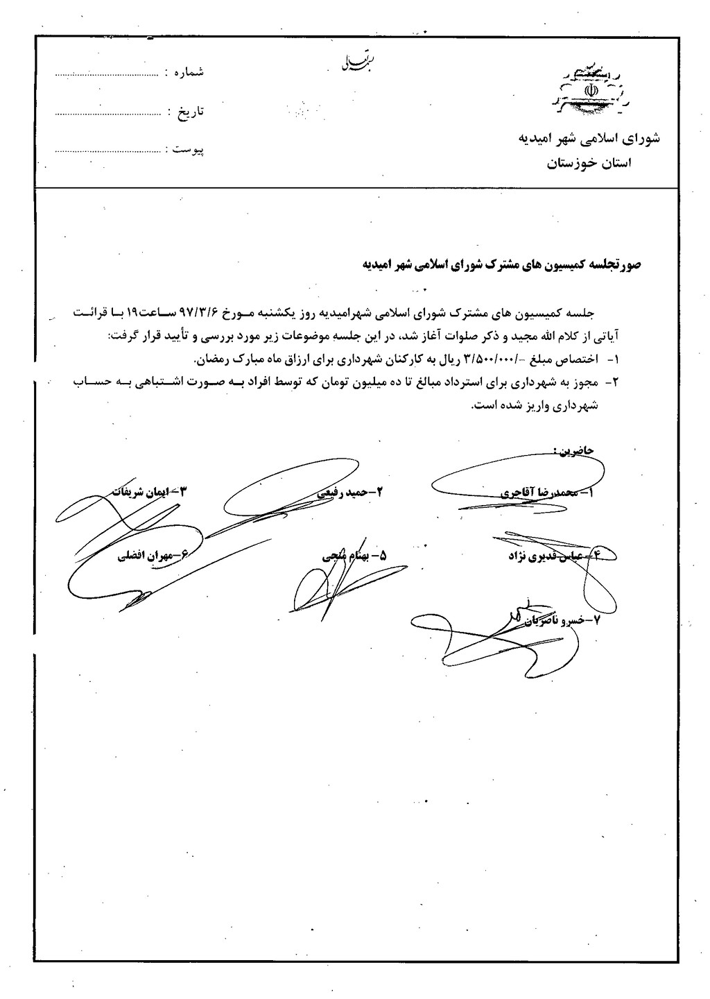 • اختصاص مبلغ ۳۵۰۰۰۰۰ ریال به کارکنان شهرداری برای ارزاق ماه مبارک رمضان.