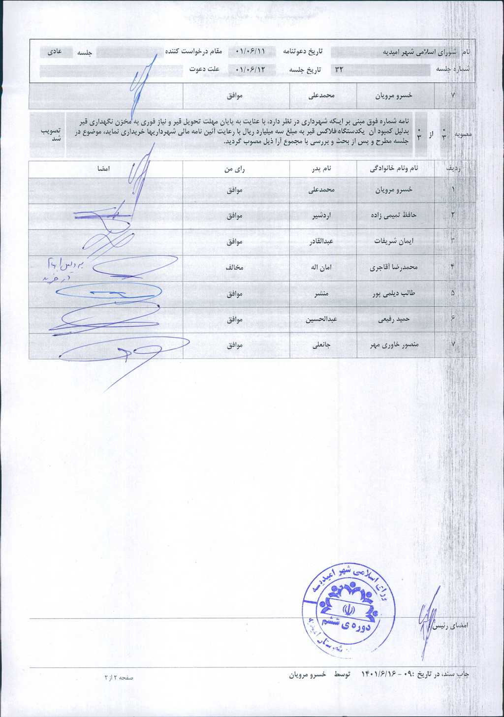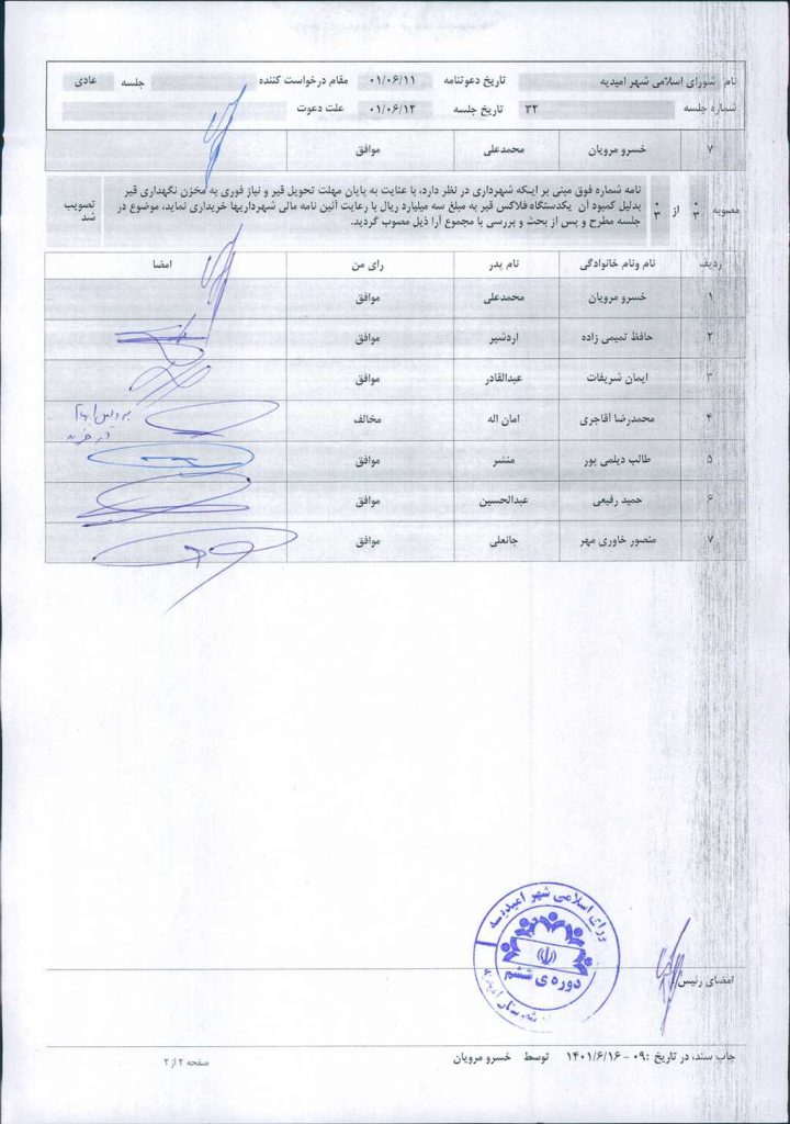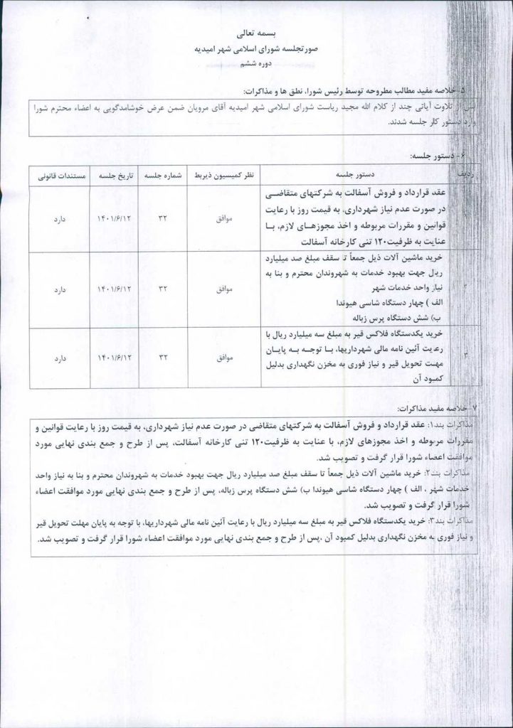 مذاکرات بند۳: خرید یکدستگاه فلاکس قیر به مبلغ سه میلیارد ریال با رعایت آئین نامه مالی شهرداریها، با توجه به پایان مهلت تحویل قیر و نیاز فوری به مخزن نگهداری بدلیل کمبود آن ،پس از طرح و جمع بندی نهایی مورد موافقت اعضاء شورا قرار گرفت و تصویب شد.