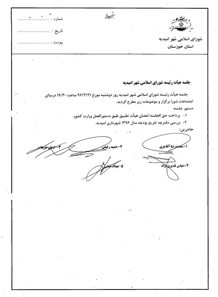 جلسه هیأت رئیسه شورای اسلامی شهر امیدیه روز دوشنبه مورخ ۲۱/۳/۹۷ ساعت ۳۰/۱۹ درسالن اجتماعات شورا برگزار و موضوعات زیر مطرح گردید.