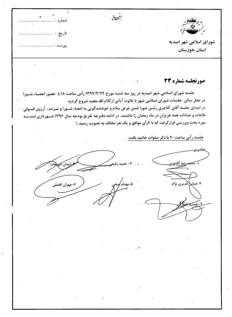 گزارش جلسه شماره ۳۲ مورخ ۹۷/۳/۲۲ شورای اسلامی شهر امیدیه