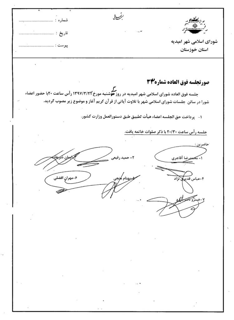 گزارش جلسه فوق العاده شماره ۳۳ شورای اسلامی شهر امیدیه