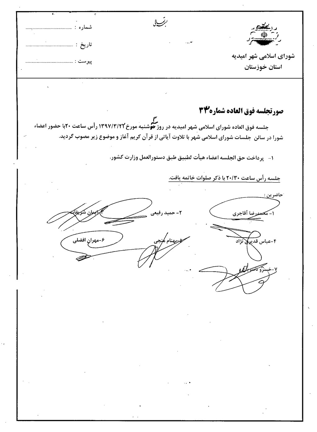 جلسه فوق العاده شورای اسلامی شهر امیدیه روز سه شنبه مورخ ۲۲/۳/۹۷ رأس ساعت ۲۰ با حضور اعضاء شورا در سالن جلسات شورای اسلامی شهر با تلاوت آیاتی از قرآن کریم آغاز و موضوع زیر مصوب گردید.