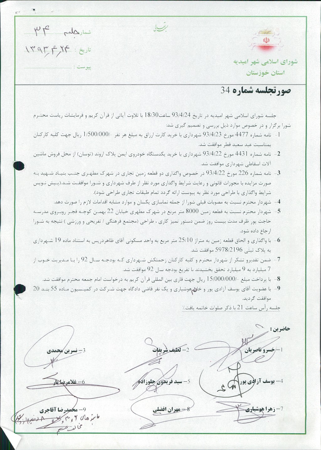 جلسه شورای اسلامی شهر امیدیه در تاریخ ۲۴/۴/۹۳ ساعت۳۰/۱۸ با تلاوت آیاتی از قرآن کریم و فرمایشات ریاست محترم شورا برگزار و در خصوص موارد ذیل بررسی و تصمیم گیری شد: