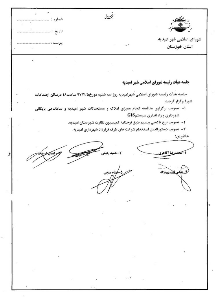 • تصویب برگزاری مناقصه انجام ممیزی املاک و مستحدثات شهر امیدیه و ساماندهی بایگانی شهرداری و راه اندازی سیستمGIS.
