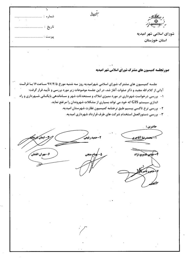 - بررسی نرخ تاکسی بیسیم طبق نرخنامه کمیسیون نظارت شهرستان امیدیه.