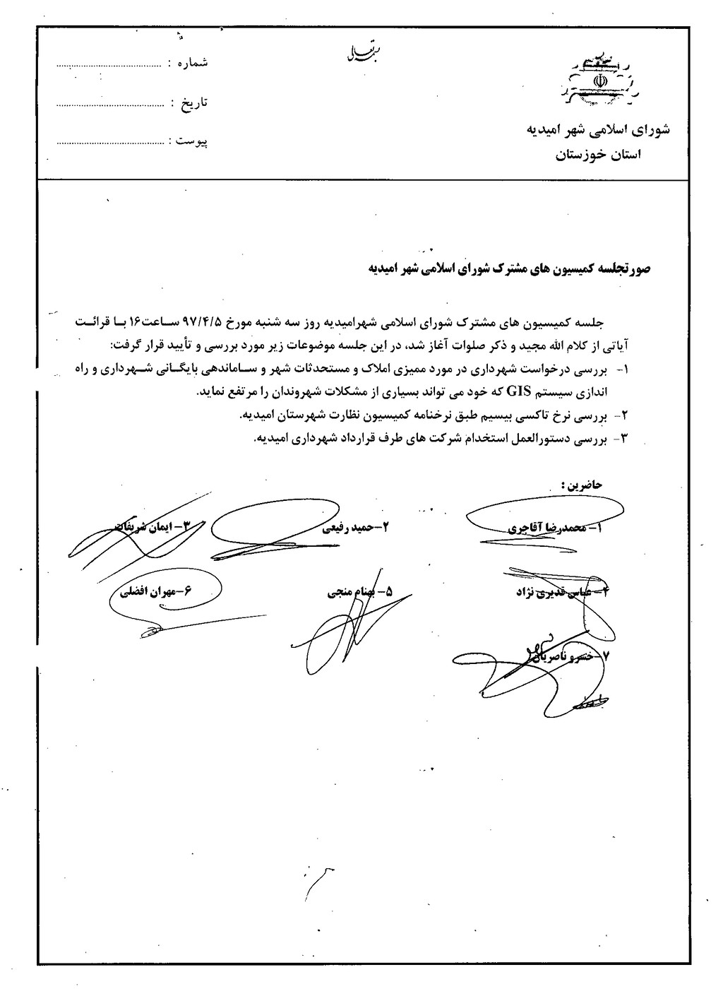جلسه کمیسیون های مشترک شورای اسلامی شهرامیدیه روز سه شنبه مورخ ۵/۴/۹۷ ساعت۱۶ با قرائت آیاتی از کلام الله مجید و ذکر صلوات آغاز شد، در این جلسه موضوعات زیر مورد بررسی و تأیید قرار گرفت: