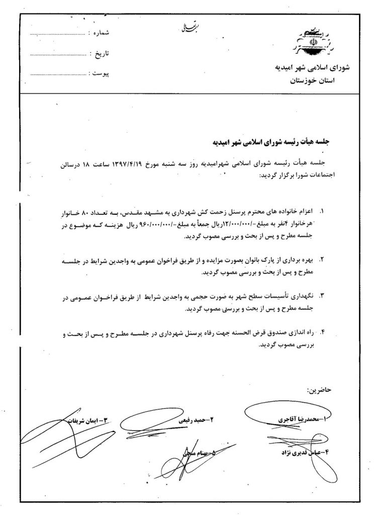 جلسه هیأت رئیسه شورای اسلامی شهرامیدیه روز سه شنبه مورخ ۱۹/۴/۱۳۹۷ ساعت ۱۸ درسالن اجتماعات شورا برگزار گردید: