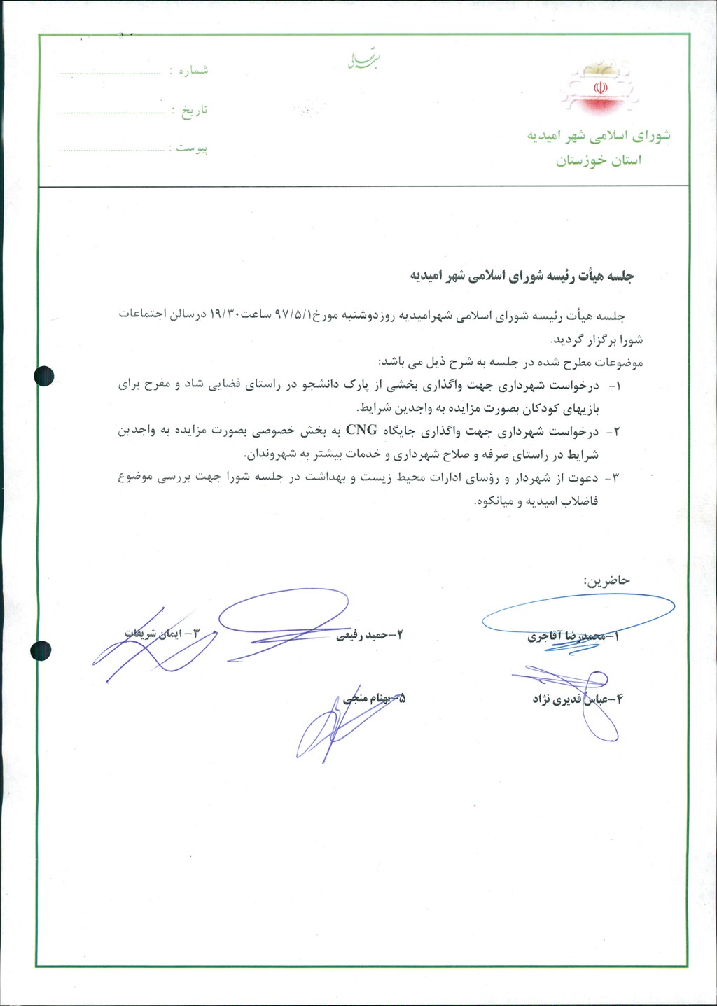 جلسه هیأت رئیسه شورای اسلامی شهرامیدیه روزدوشنبه مورخ۱/۵/۹۷ ساعت۳۰/۱۹ درسالن اجتماعات شورا برگزار گردید.
