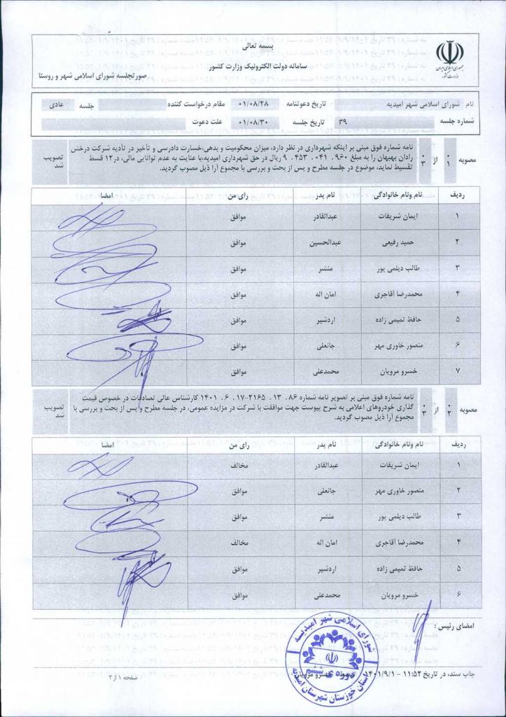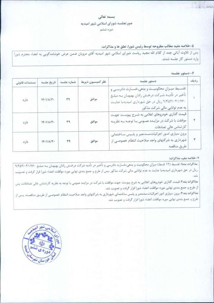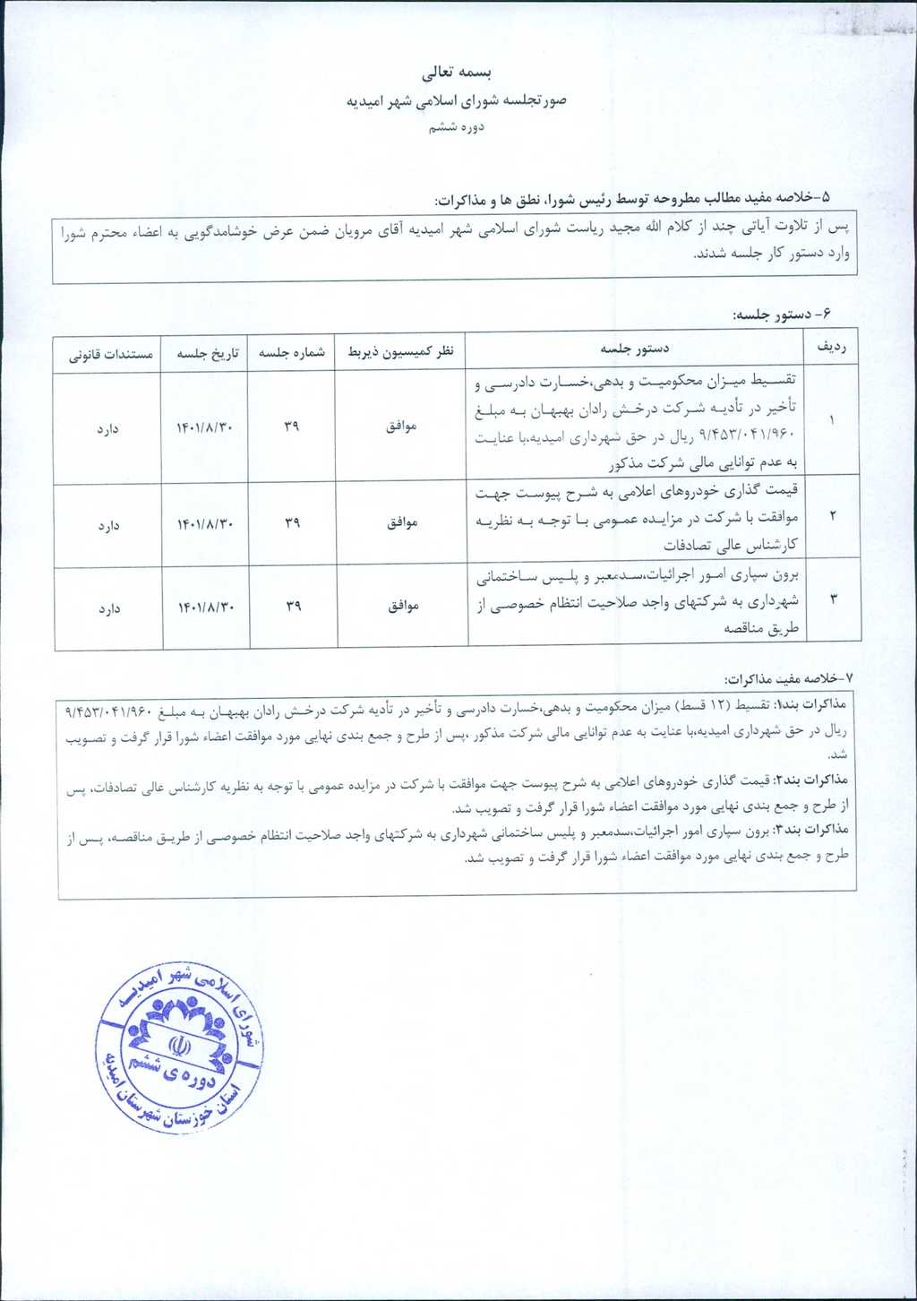 مذاکرات بند۱: تقسیط (۱۲ قسط) میزان محکومیت و بدهی،خسارت دادرسی و تأخیر در تأدیه شرکت درخش رادان بهبهان به مبلغ ۹۶۰/ ۰۴۱/ ۴۵۳ /۹ ریال در حق شهرداری امیدیه،با عنایت به عدم توانایی مالی شرکت مذکور ،پس از طرح و جمع بندی نهایی مورد موافقت اعضاء شورا قرار گرفت و تصویب شد.