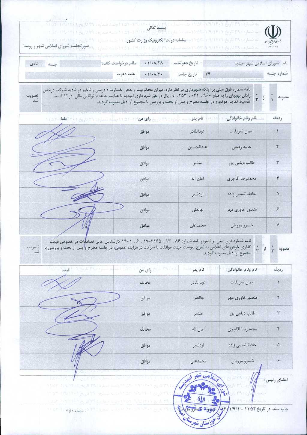 مذاکرات بند۲: قیمت گذاری خودروهای اعلامی( پیوست) جهت موافقت با شرکت در مزایده عمومی با توجه به نظریه کارشناس عالی تصادفات، پس از طرح و جمع بندی نهایی مورد موافقت اعضاء شورا قرار گرفت و تصویب شد.