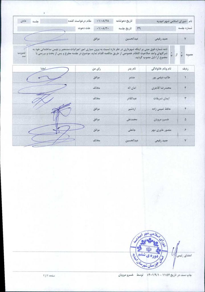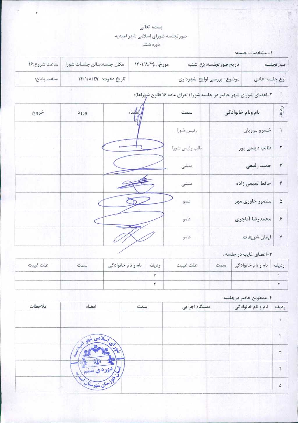 گزارش جلسه شماره ۳۹ مورخ ۱۴۰۱/۸/۳۰ شورای اسلامی شهر امیدیه