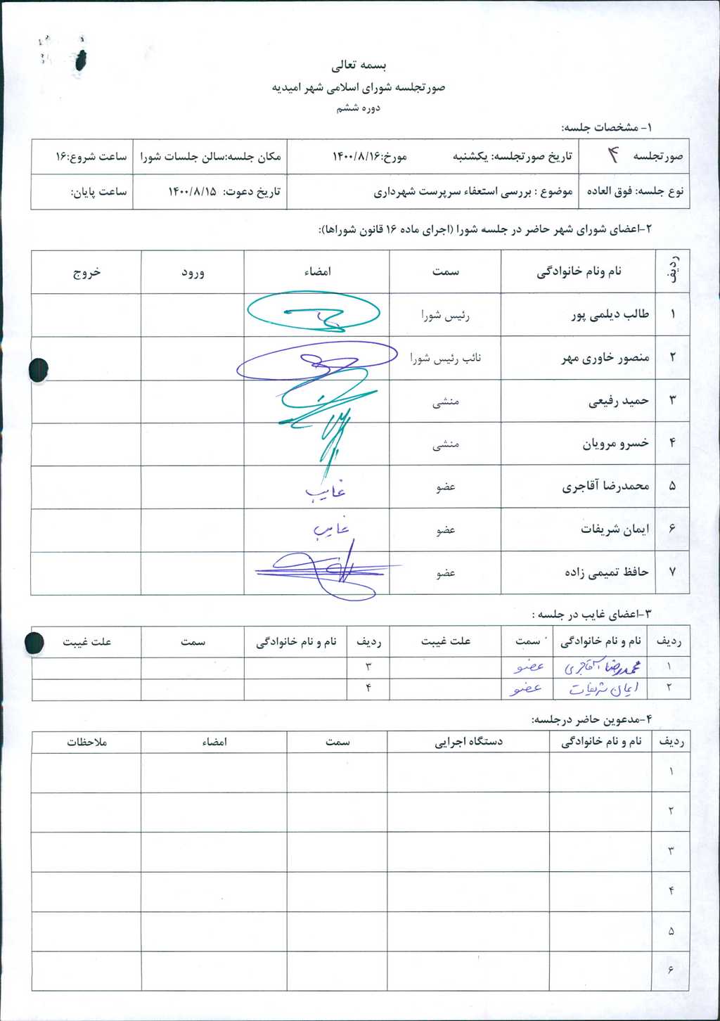 گزارش جلسه شماره ۴ مورخ ۱۴۰۰/۸/۱۶ شورای اسلامی شهر امیدیه