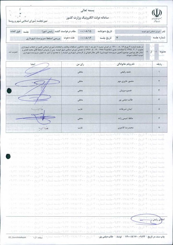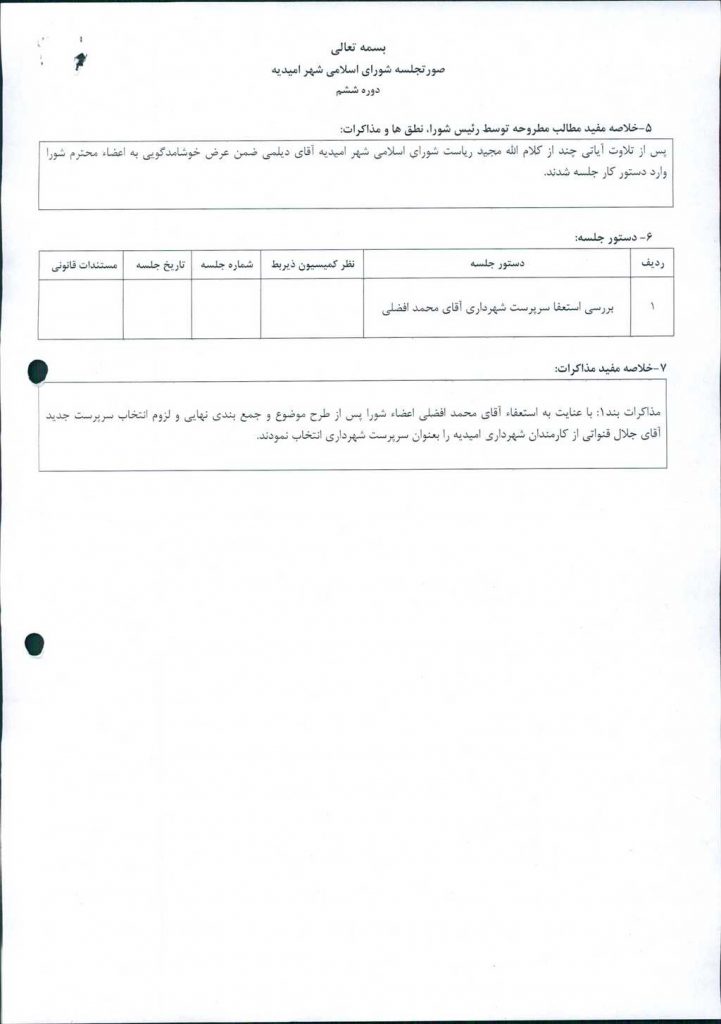 مذاکرات بند۱: با عنایت به استعفاء آقای محمد افضلی اعضاء شورا پس از طرح موضوع و جمع بندی نهایی و لزوم انتخاب سرپرست جدید آقای جلال قنواتی از کارمندان شهرداری امیدیه را بعنوان سرپرست شهرداری انتخاب نمودند.