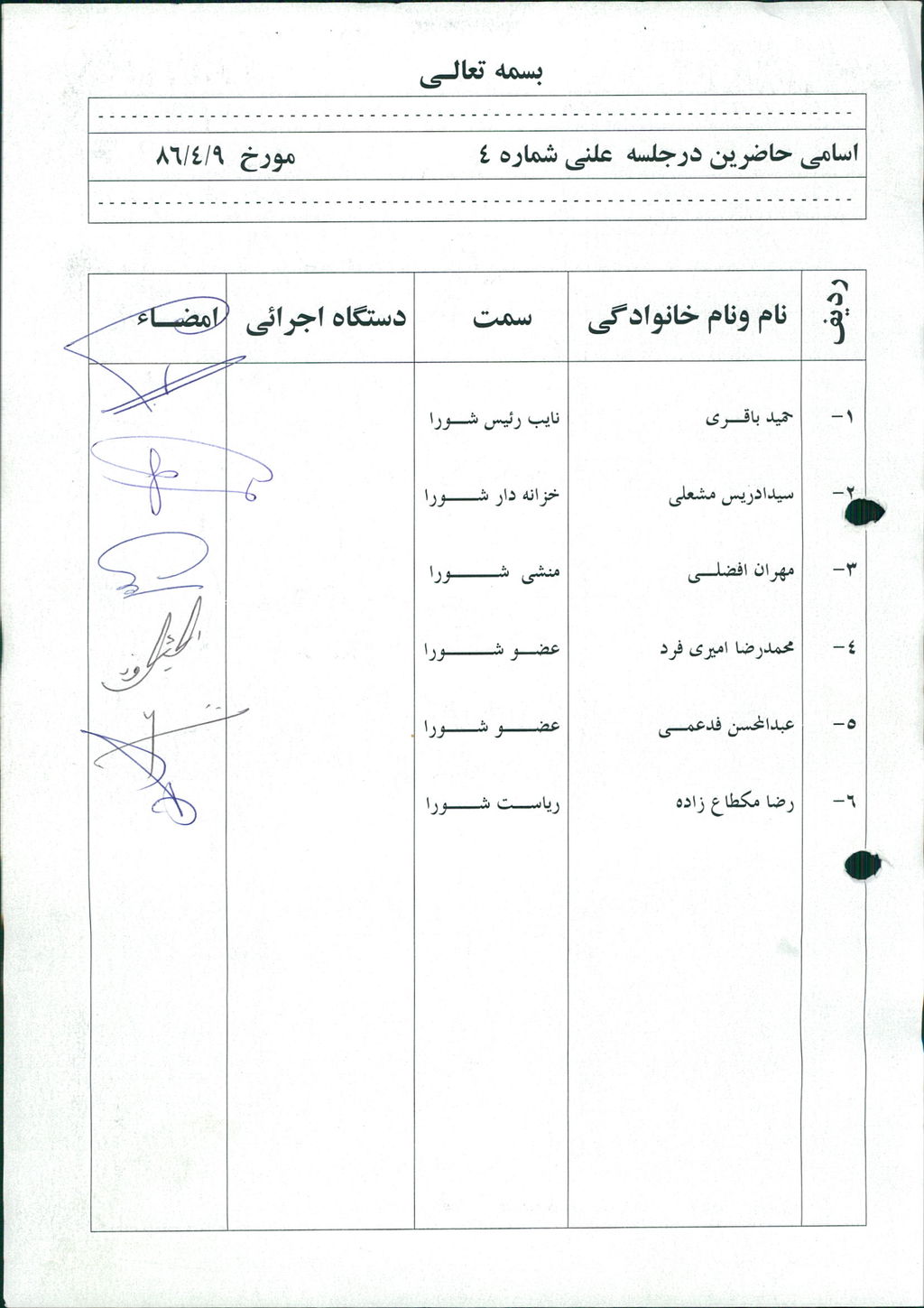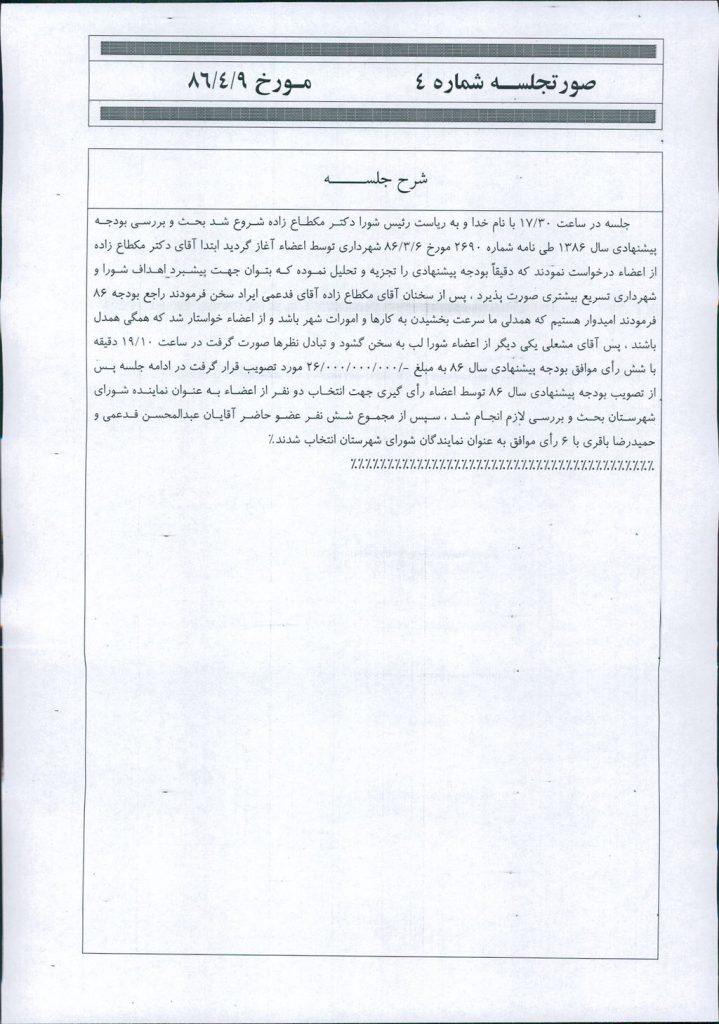 جلسه در ساعت ۳۰/۱۷ با نام خدا و به رياست رئيس شورا دكتر مكطاع زاده شروع شد بحث و بررسي بودجه پيشنهادي سال ۱۳۸۶ طي نامه شماره ۲۶۹۰ مورخ ۶/۳/۸۶ شهرداري توسط اعضاء آغاز گرديد ابتدا آقاي دكتر مكطاع زاده از اعضاء درخواست نمودند كه دقيقاً بودجه پيشنهادي را تجزيه و تحليل نموده كه بتوان جهت پيشبرد اهداف شورا و شهرداري تسريع بيشتري صورت پذيرد ، پس از سخنان آقاي مكطاع زاده آقاي فدعمي ايراد سخن فرمودند راجع بودجه ۸۶ فرمودند اميدوار هستيم كه همدلي ما سرعت بخشيدن به كارها و امورات شهر باشد و از اعضاء خواستار شد كه همگي همدل باشند ، پس آقاي مشعلي يكي ديگر از اعضاء شورا لب به سخن گشود و تبادل نظرها صورت گرفت در ساعت ۱۰/۱۹ دقيقه با شش رأي موافق بودجه پيشنهادي سال ۸۶ به مبلغ -/۰۰۰/۰۰۰/۰۰۰/۲۶ مورد تصويب قرار گرفت در ادامه جلسه پس از تصويب بودجه پيشنهادي سال ۸۶ توسط اعضاء رأي گيري جهت انتخاب دو نفر از اعضاء به عنوان نماينده شوراي شهرستان بحث و بررسي لازم انجام شد ، سپس از مجموع شش نفر عضو حاضر آقايان عبدالمحسن فدعمي و حميدرضا باقري با ۶ رأي موافق به عنوان نمايندگان شوراي شهرستان انتخاب شدند%