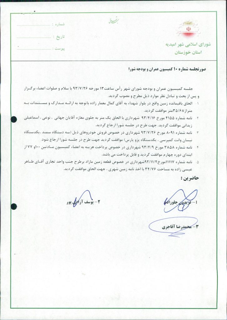 - نامه شماره ۱۱۱۱۷مورخ۲/۱۱/۹۲شهرداری در خصوص قطعه زمین مازاد برطرح جنب واحد تجاری آقای طاهر عیسی زاده به مساحت ۷۶/۳۴ با اخذ نامه زمین شهری ، جهت الحاق موافقت گردید.