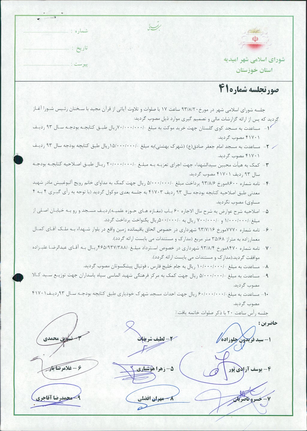 - کمک به هیأت محبین سیدالشهداء جهت اجرای تعزیه به مبلغ ۲۰۰۰۰۰۰۰ ریال طبق اصلاحیه کتابچه بودجه سال ۹۳ ردیف ۴۱۷۰۱ مصوب گردید.