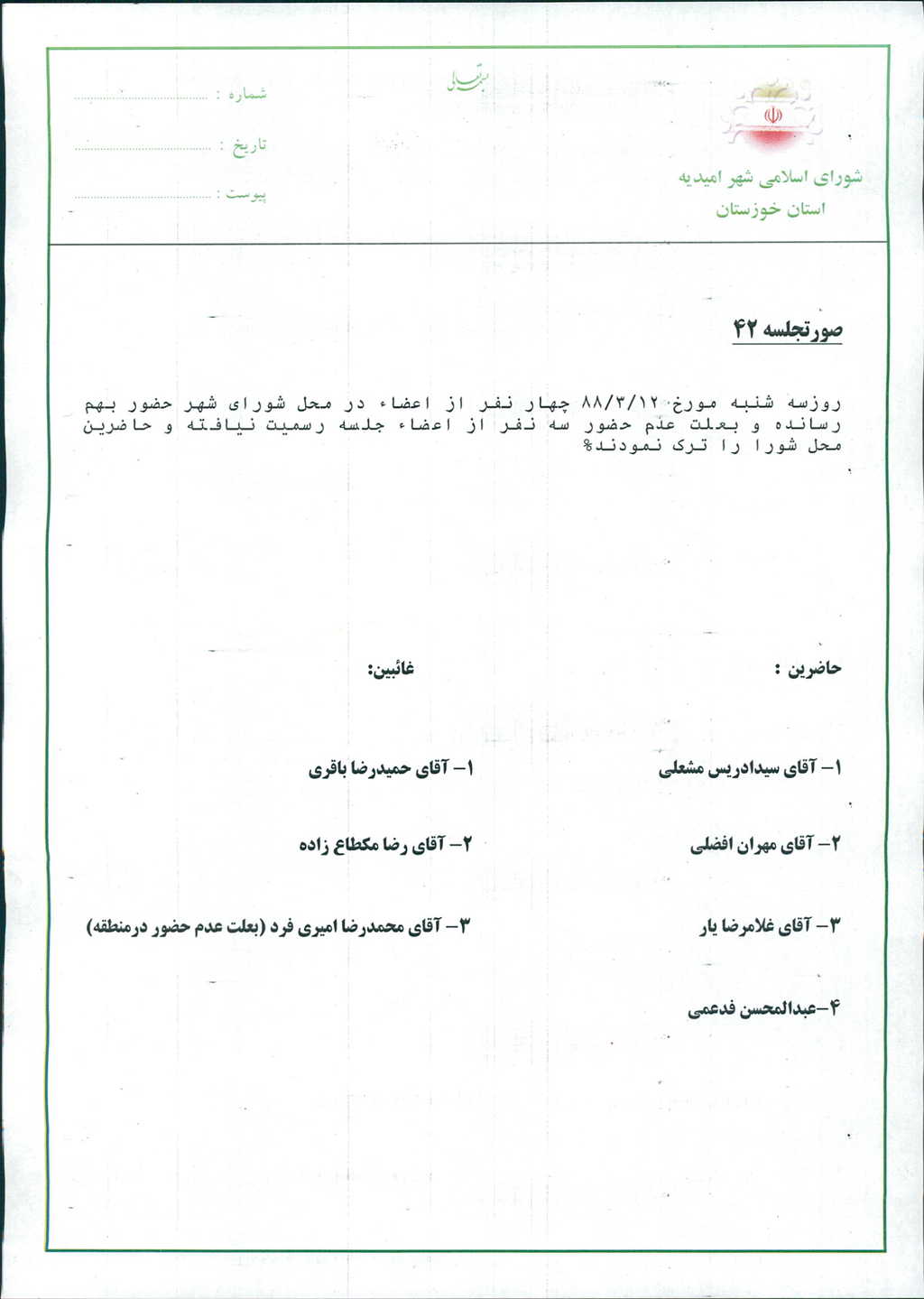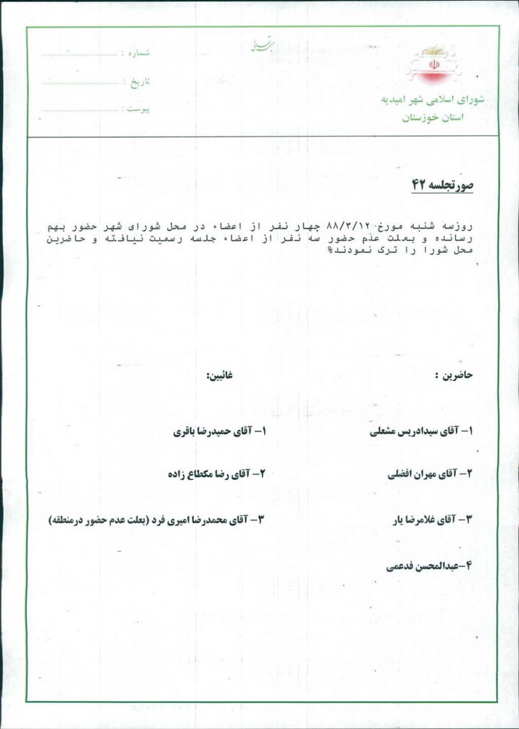 گزارش جلسه شماره ۴۲ مورخ ۸۸/۳/۱۲ شورای اسلامی شهر امیدیه
