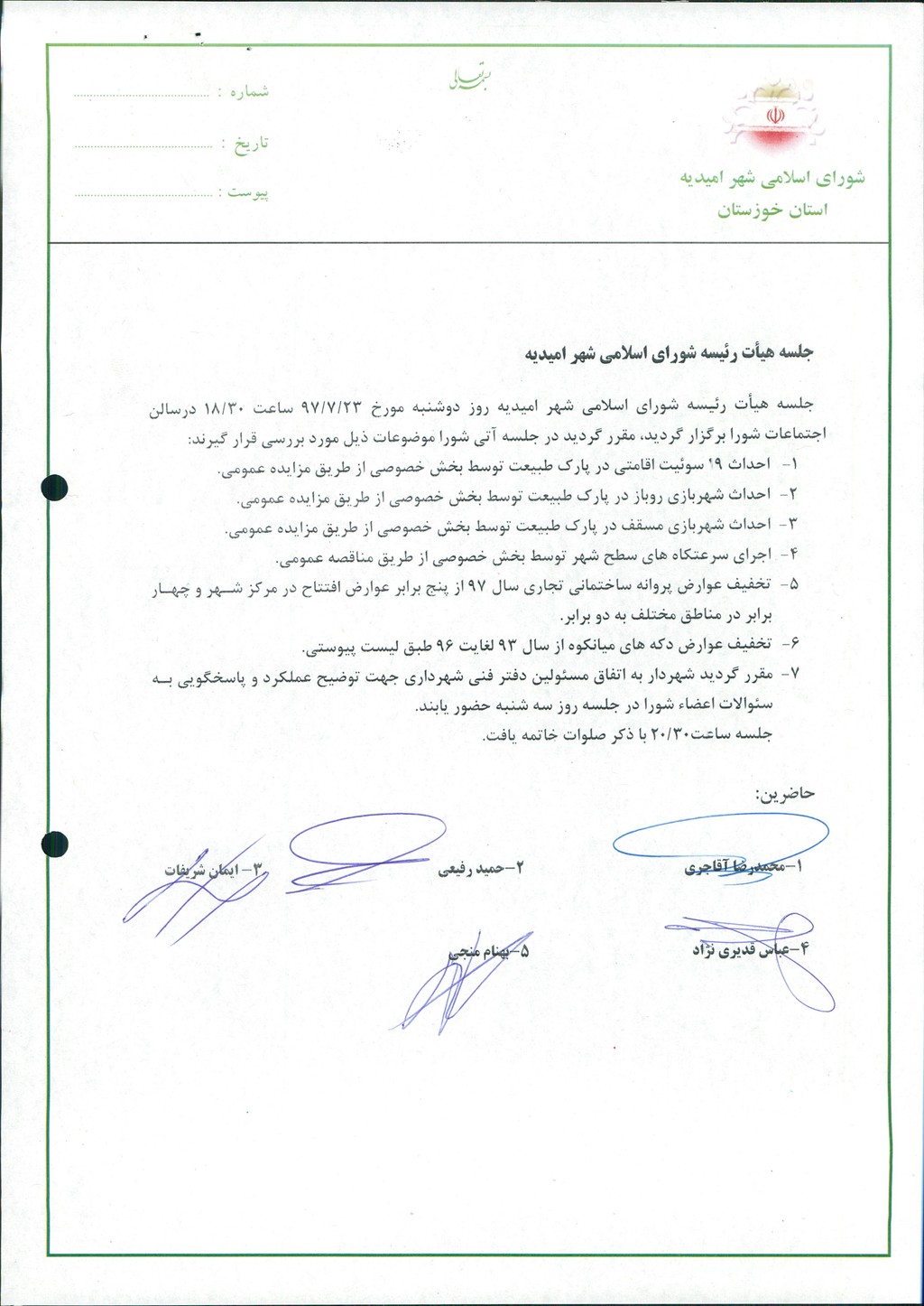جلسه هیأت رئیسه شورای اسلامی شهر امیدیه روز دوشنبه مورخ ۲۳/۷/۹۷ ساعت ۳۰/۱۸ درسالن اجتماعات شورا برگزار گردید، مقرر گردید در جلسه آتی شورا موضوعات ذیل مورد بررسی قرار گیرند: