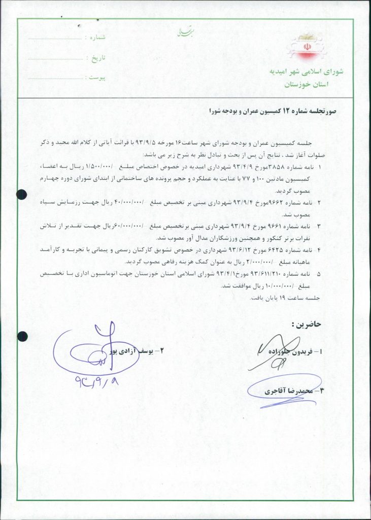 - نامه شماره ۲۱۰/۶۱۱/۹۳ مورخ۱/۴/۹۳ شـورای اسلامی استان خوزستان جهت اتـوماسیون اداری با تخصیص مبلغ ۱۰۰۰۰۰۰۰ ریال موافقت شد.