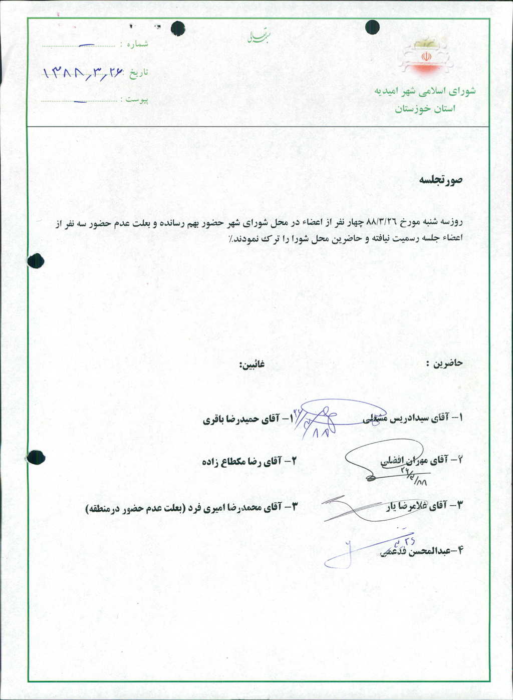 روزسه شنبه مورخ ۸۸/۳/۲۶ چهار نفر از اعضاء در محل شورای شهر حضور بهم رسانده و بعلت عدم حضور سه نفر از اعضاء جلسه رسمیت نیافته و حاضرین محل شورا را ترک نمودند%